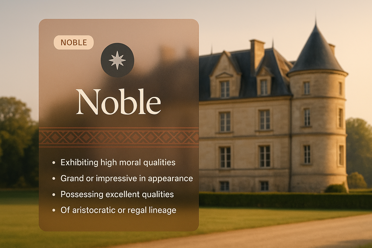 /Collection: /by davooda/Type: PNG/A sophisticated web design panel featuring a transparent overlay with the word 'Noble.' The panel includes a title, icon, and text block detailing noble qualities against a serene background.