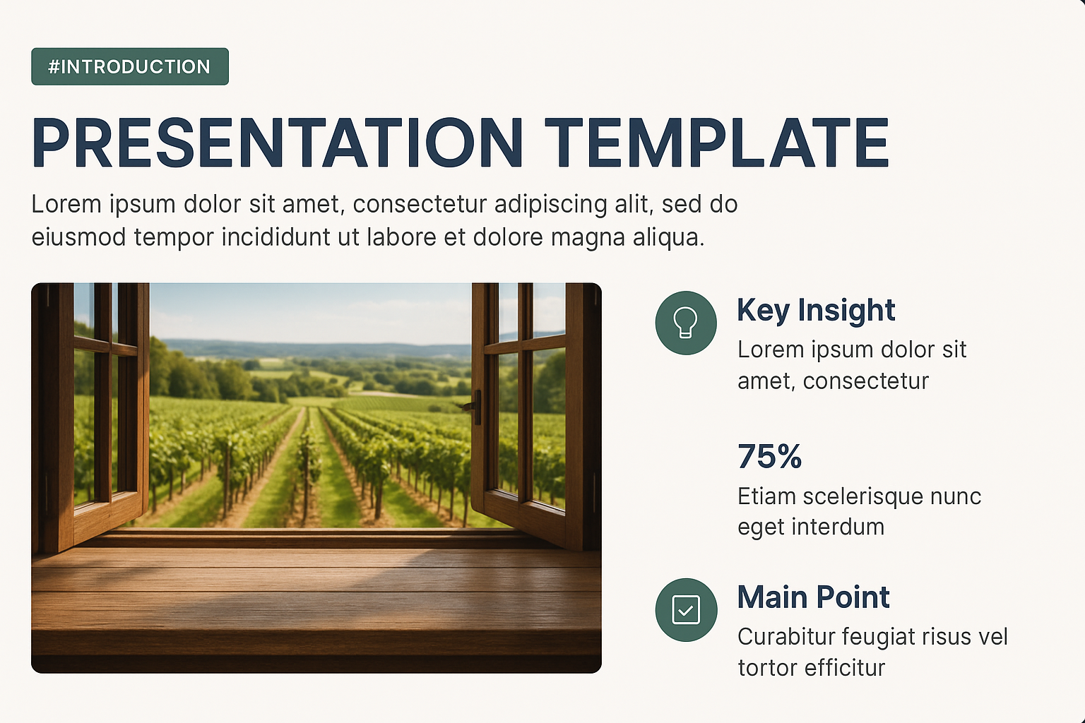 /Collection: /by davooda/Type: PNG/Professional presentation template featuring a scenic window view overlooking vineyards, designed for engaging key insights and points, ideal for business or educational use.