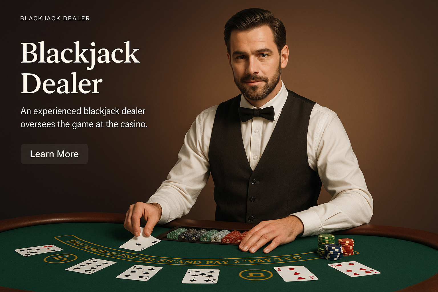 /Collection: /by davooda/Type: PNG/A well-dressed blackjack dealer is featured at a casino table, showcasing a professional atmosphere. The design includes a clear call-to-action button for user engagement.