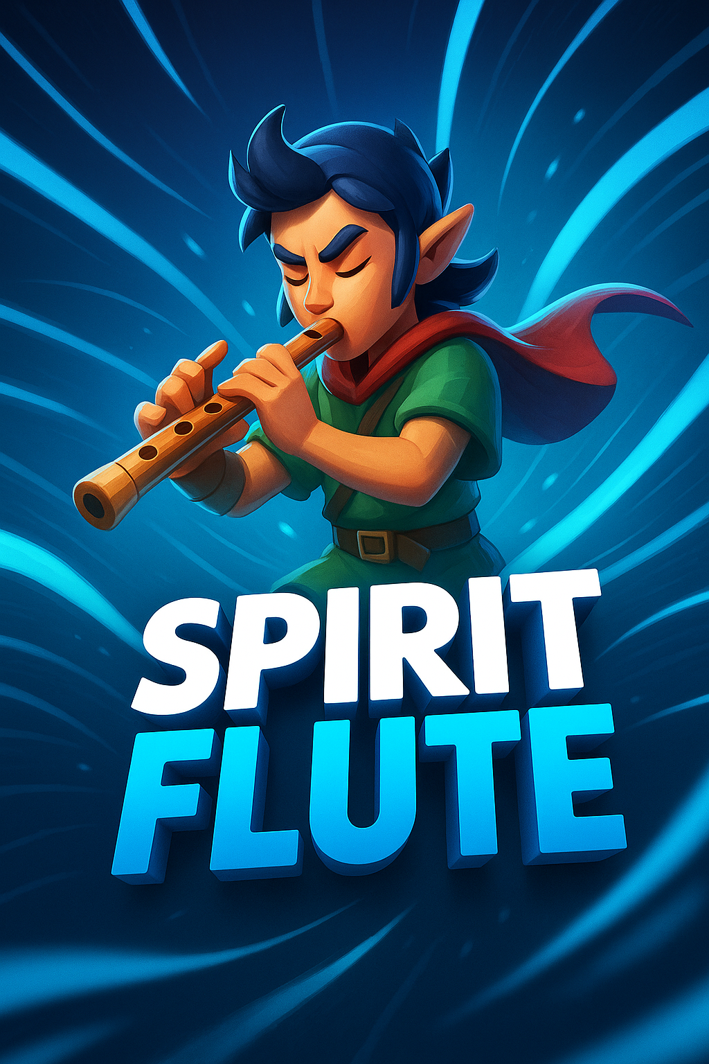 /Collection: /by davooda/Type: PNG/A vibrant 3D illustration of a character playing a spirit flute, set against dynamic blue swirling lines. The title 'SPIRIT FLUTE' is prominently displayed in bold, engaging font.