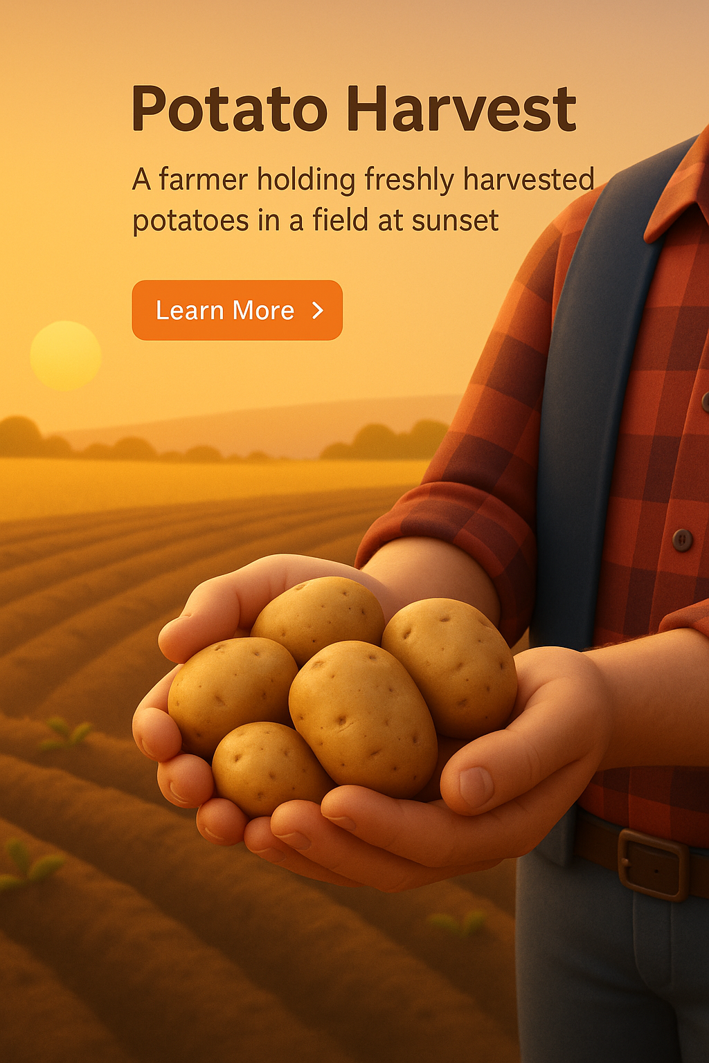 A visually striking 3D illustration of a farmer holding freshly harvested potatoes against a sunset backdrop. The scene features a layered composition with a gradient background and clear text elements.