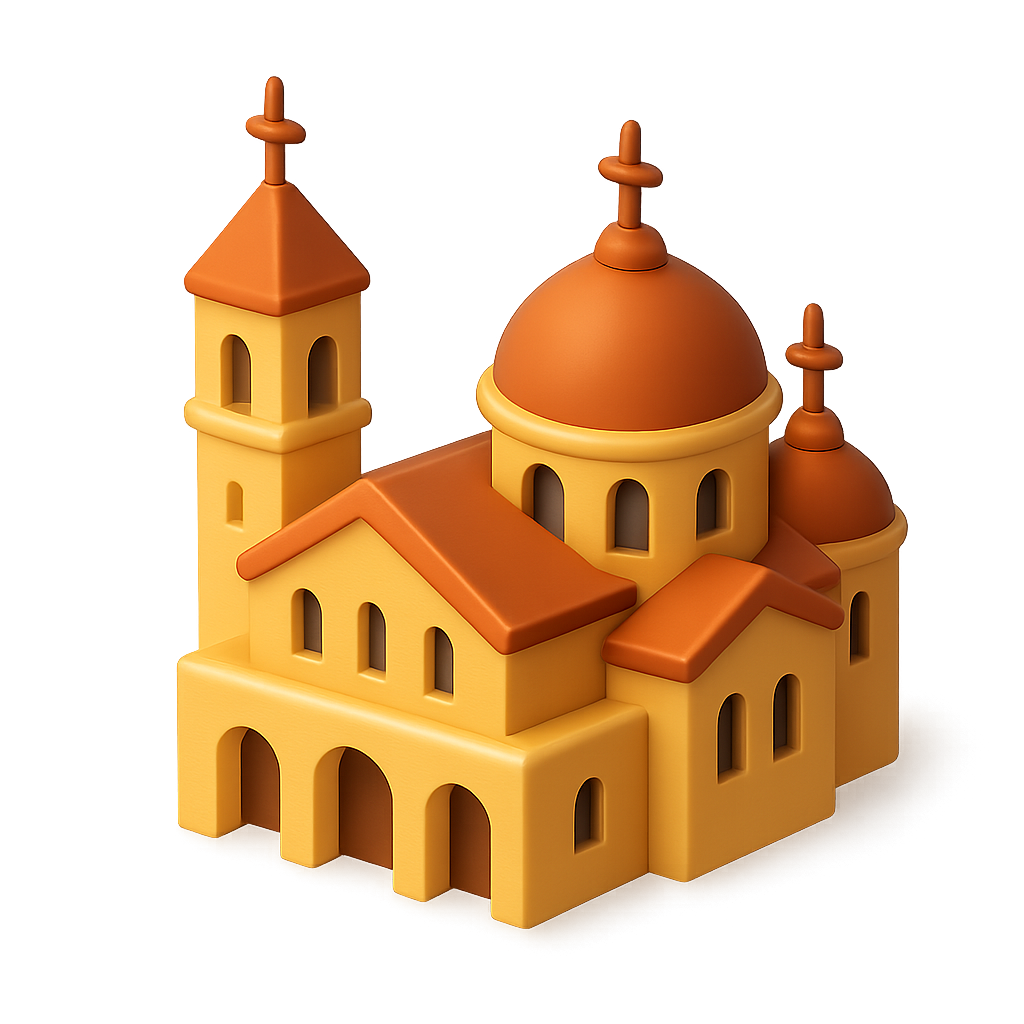 A colorful 3D representation of a basilica, featuring orange domes and a unique architectural design. The isometric view showcases its volumetric feel against a soft gradient background.