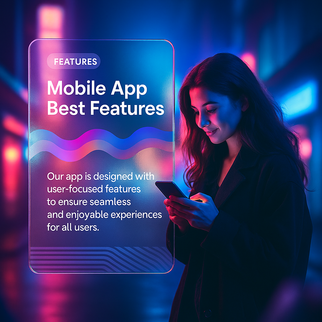 /Collection: /by davooda/Type: PNG/A vibrant night city scene featuring a woman engaged with a mobile app under colorful neon lights. The composition highlights user-friendly app features with a stylish overlay.