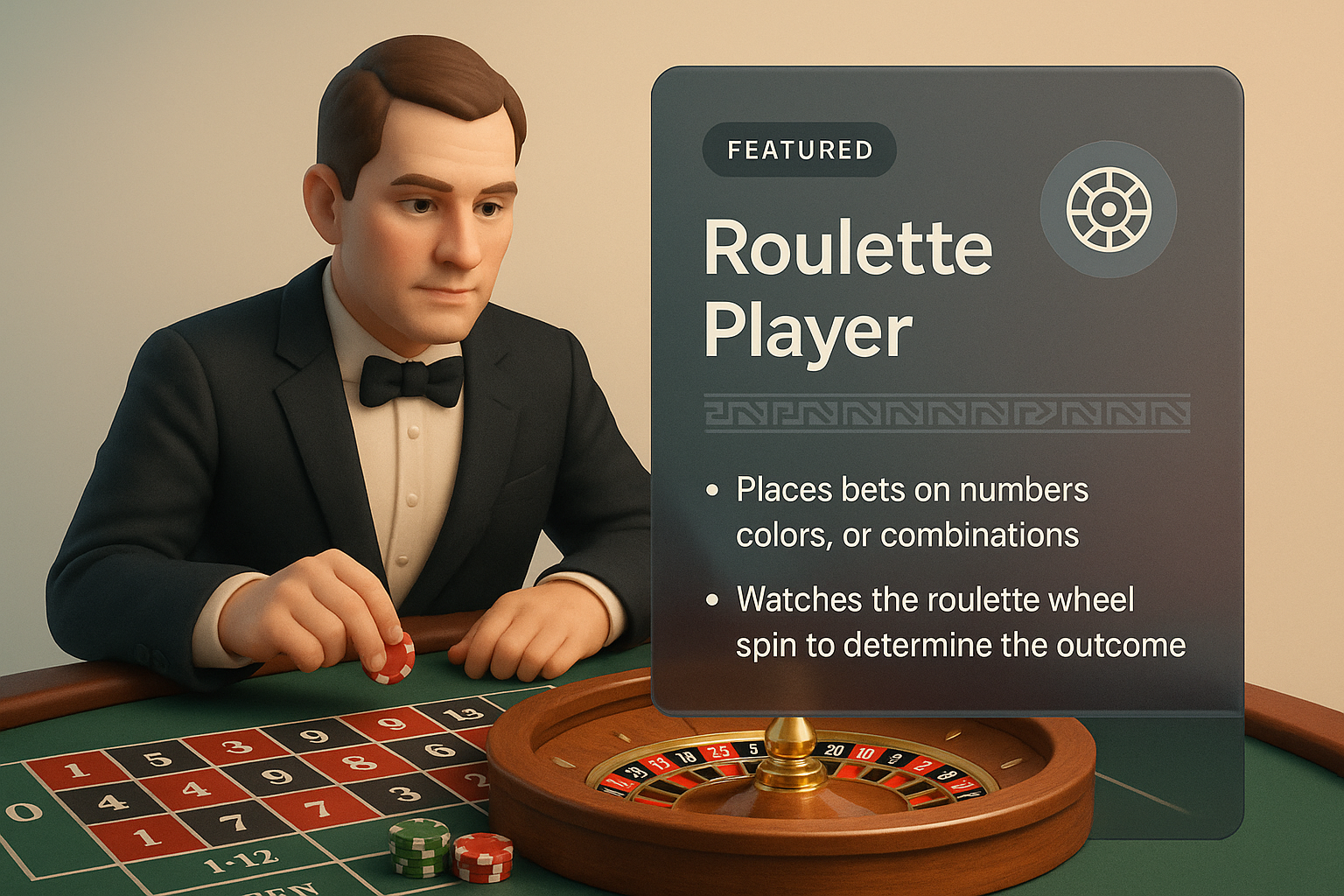A 3D depiction of a roulette player engaged at a casino table, with vibrant colors and an integrated info panel. The scene captures the excitement of gambling.