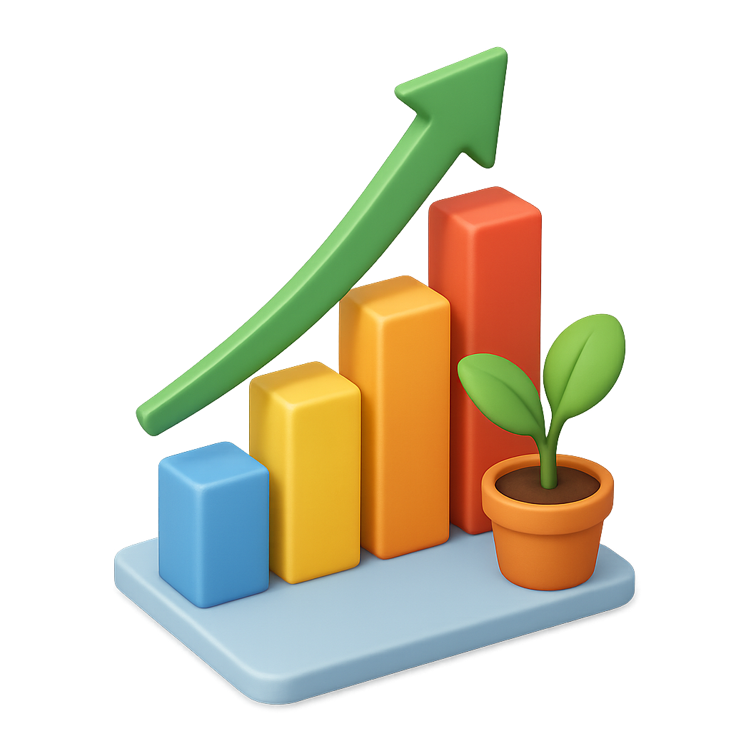 A vibrant 3D growth icon featuring colorful bar graphs in blue, yellow, orange, and red, along with a green upward arrow and a potted plant, all set against a transparent background.