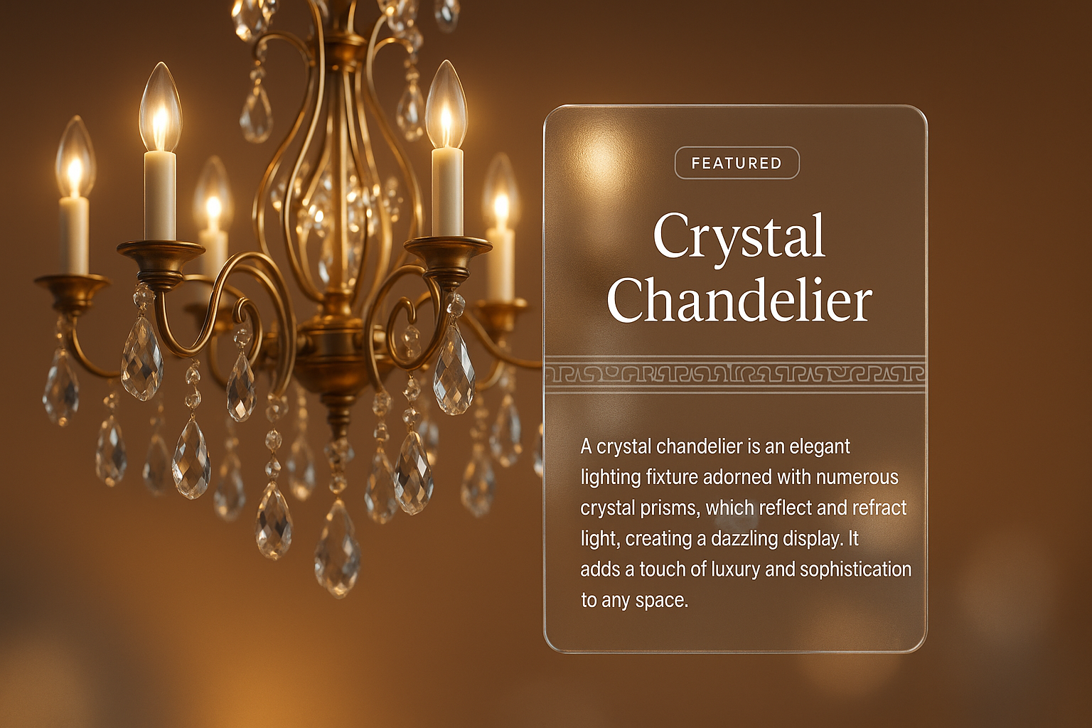 A stunning crystal chandelier adorned with glimmering prisms and warm lighting, integrated into a soft gradient backdrop. The design features elegant text blocks and a sophisticated frame.