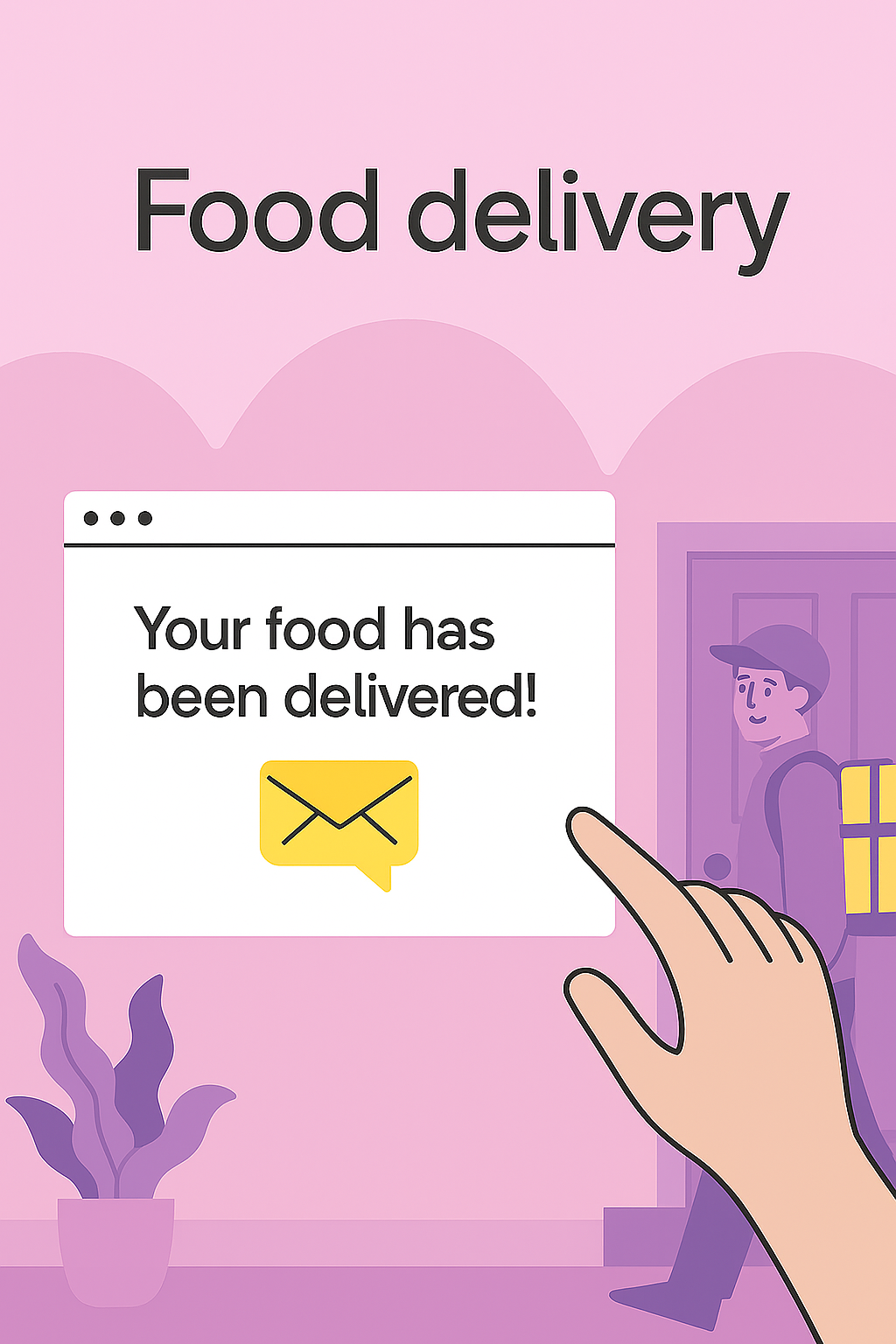 /Collection: /by davooda/Type: PNG/A modern and playful illustration depicting a food delivery notification with a hand reaching out to a message bubble. Ideal for apps or websites focused on food services.