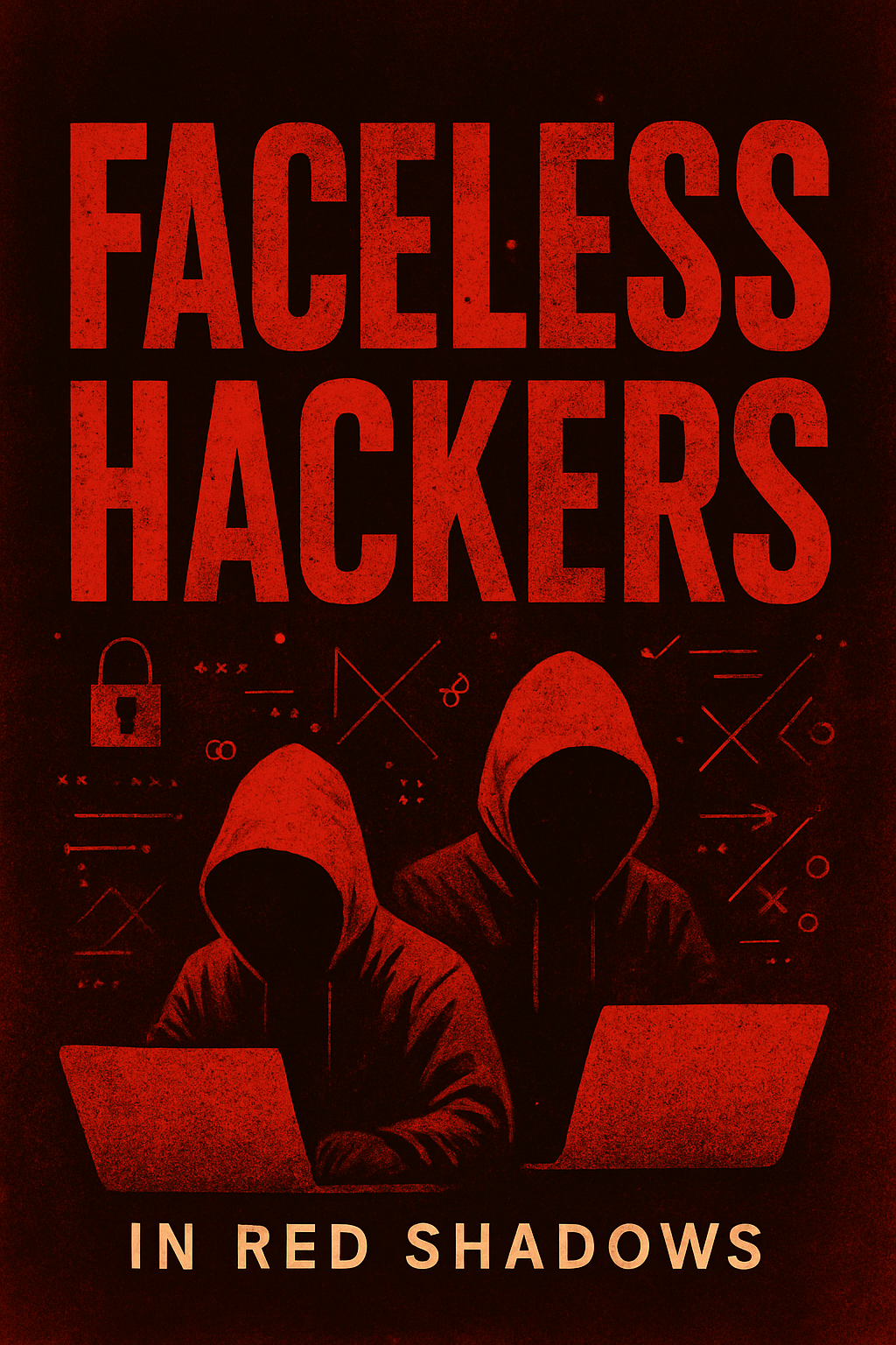 Striking poster design depicting faceless hackers in shadowy red tones, ideal for promoting cybersecurity awareness or tech-related events.