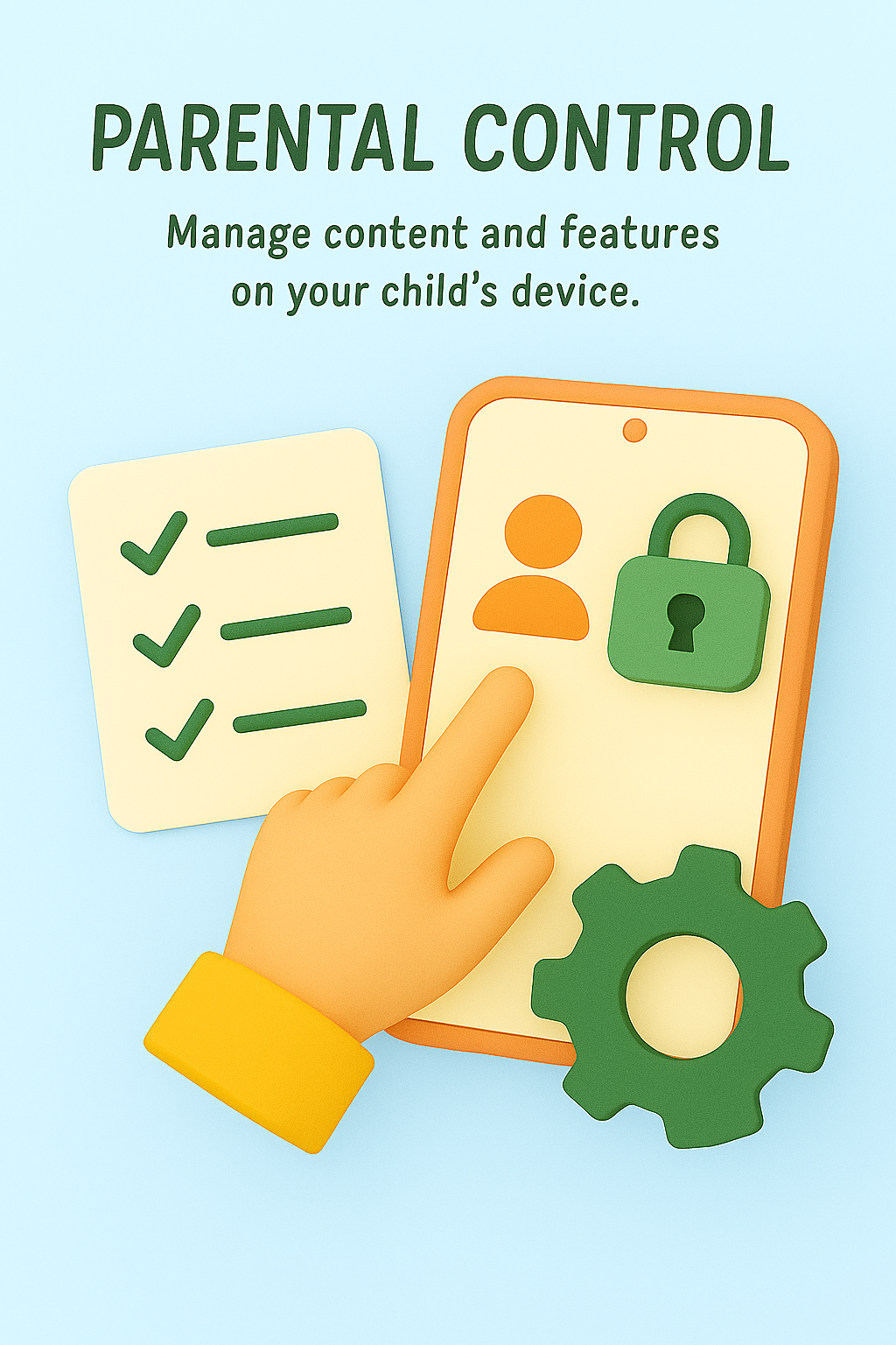 /Collection: /by davooda/Type: PNG/A playful and colorful illustration depicting parental control features on a mobile device, ideal for apps or services targeting child safety and content management.
