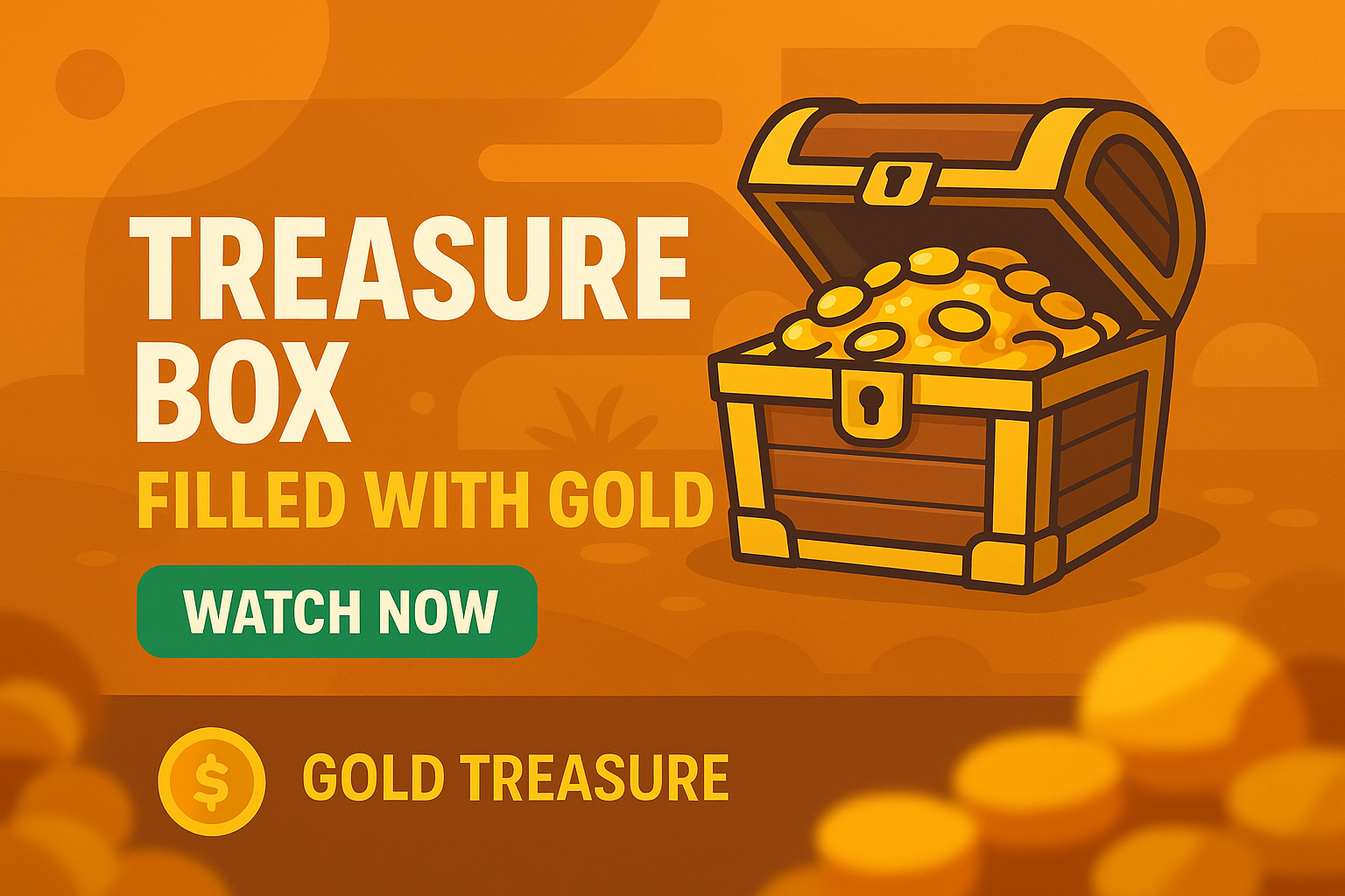 Vibrant digital illustration featuring a treasure chest overflowing with gold coins, ideal for promotions or gaming content. The design uses bold colors and playful elements to attract viewers.
