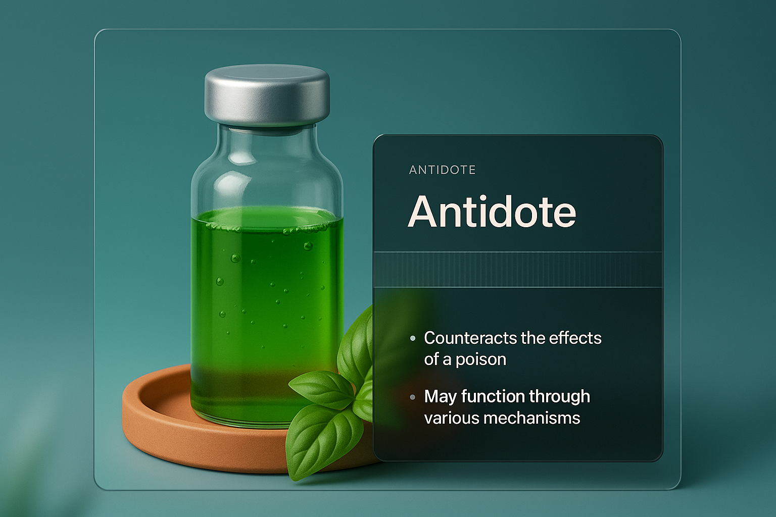 /Collection: /by davooda/Type: PNG/A 3D illustration of a green antidote bottle with a sleek metallic lid, displayed on a round clay base. The design features an integrated dark overlay with text and subtle patterns for depth.