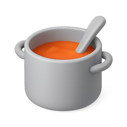 A modern, minimalist illustration of a cooking pot filled with orange soup and a spoon, suitable for culinary-related graphics or food blogs.
