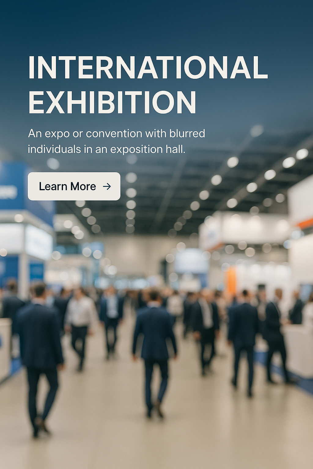 /Collection: /by davooda/Type: PNG/The image depicts a bustling exposition hall with blurred figures representing attendees at an international exhibition. The modern design emphasizes a corporate atmosphere.