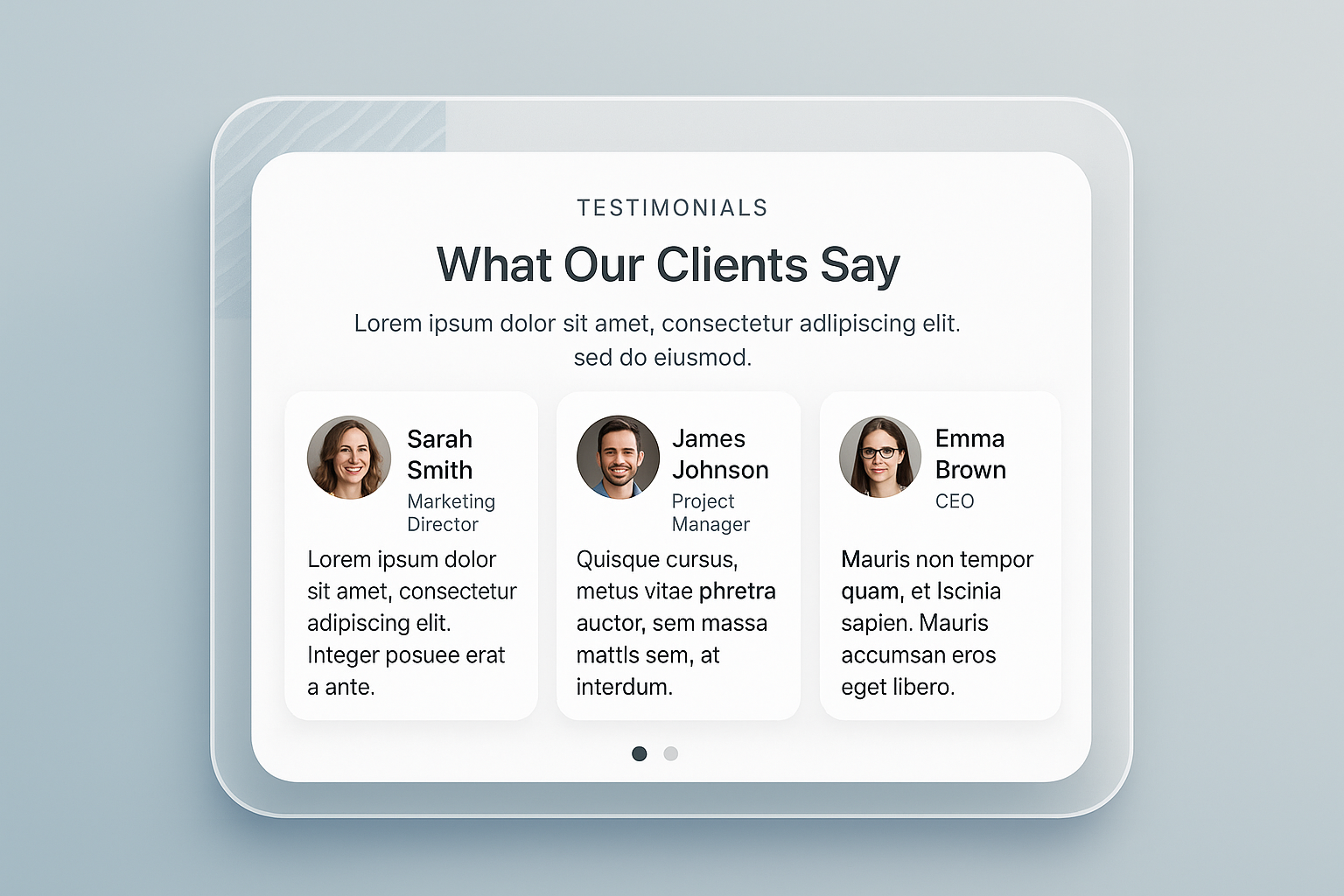 /Collection: /by davooda/Type: PNG/A modern testimonials section featuring three testimonial cards with author photos, names, and quotes, alongside a realistic smartphone mockup on a gradient background.