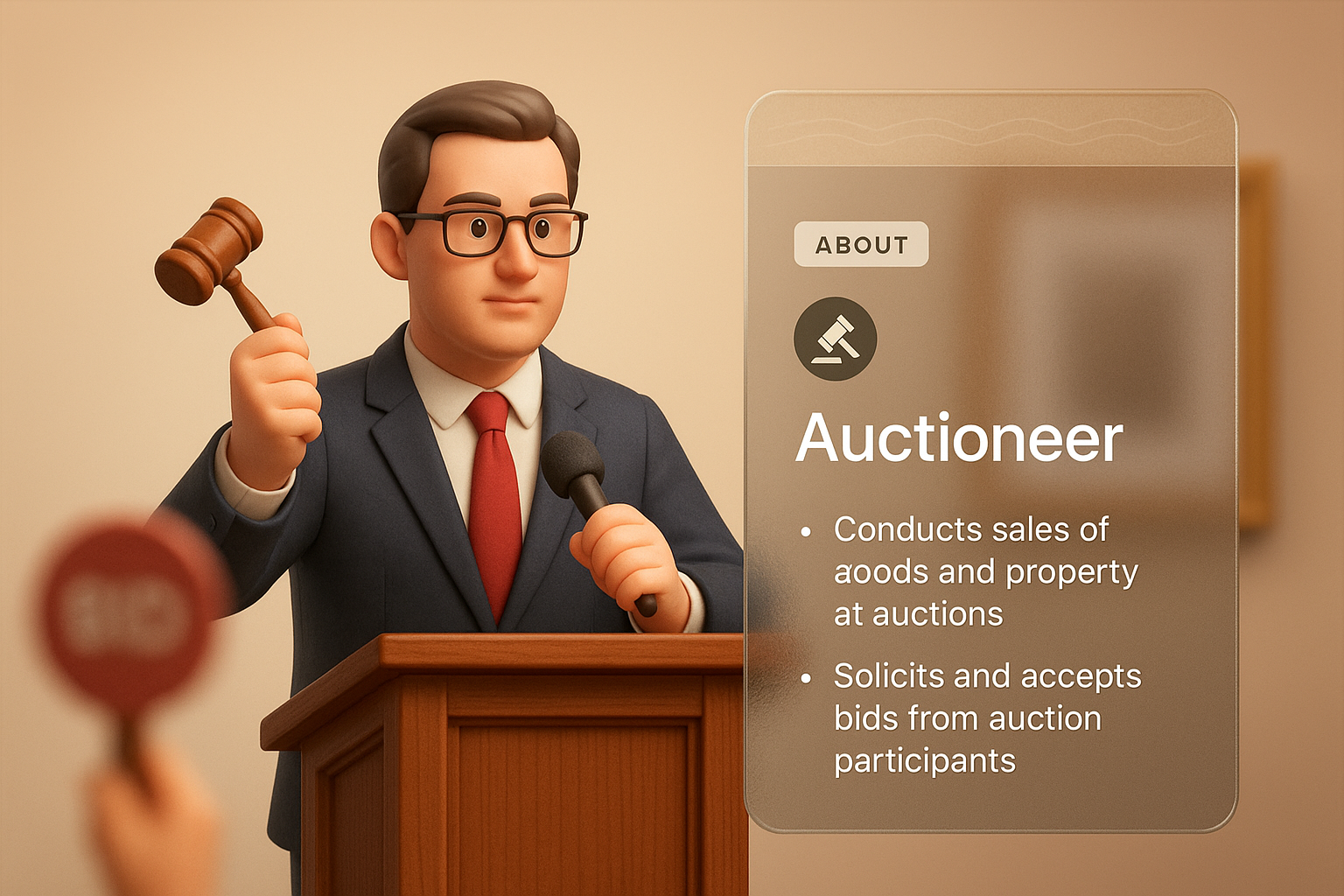 /Collection: /by davooda/Type: PNG/A vibrant 3D illustration of an auctioneer holding a gavel at an auction. The image features an integrated information block with a clean design, ensuring text readability against a smooth gradient background.
