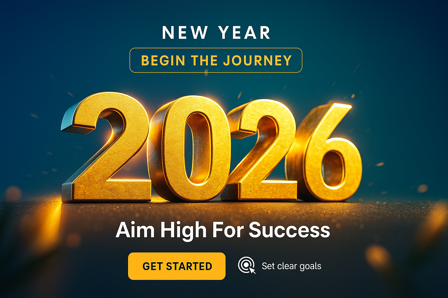 /Collection: /by davooda/Type: PNG/A striking 3D illustration of the year 2026 in gold, set against a vibrant backdrop. The design features a motivational call to action, inviting viewers to set goals for the new year.