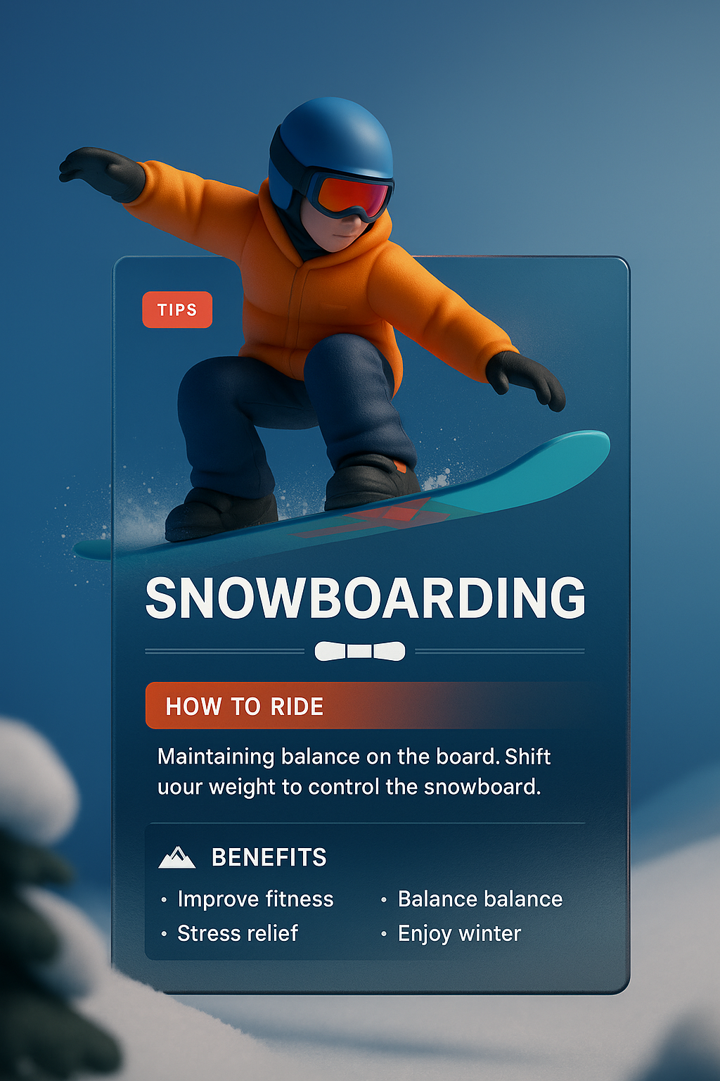 /Collection: /by davooda/Type: PNG/A visually engaging web design concept featuring a 3D snowboarder in action. The design includes a tips section with clear text, icons, and a cohesive color scheme for optimal readability.