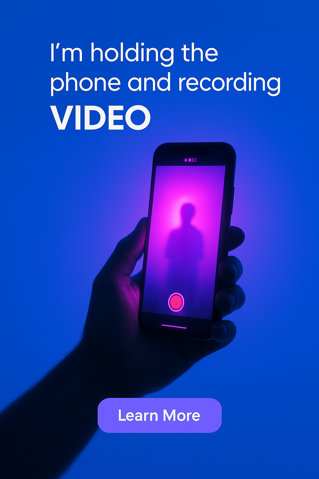 A hand holds a phone recording a video, emitting a neon-pink glow. The background is a solid blue, enhancing the glowing effect and creating a vibrant atmosphere.