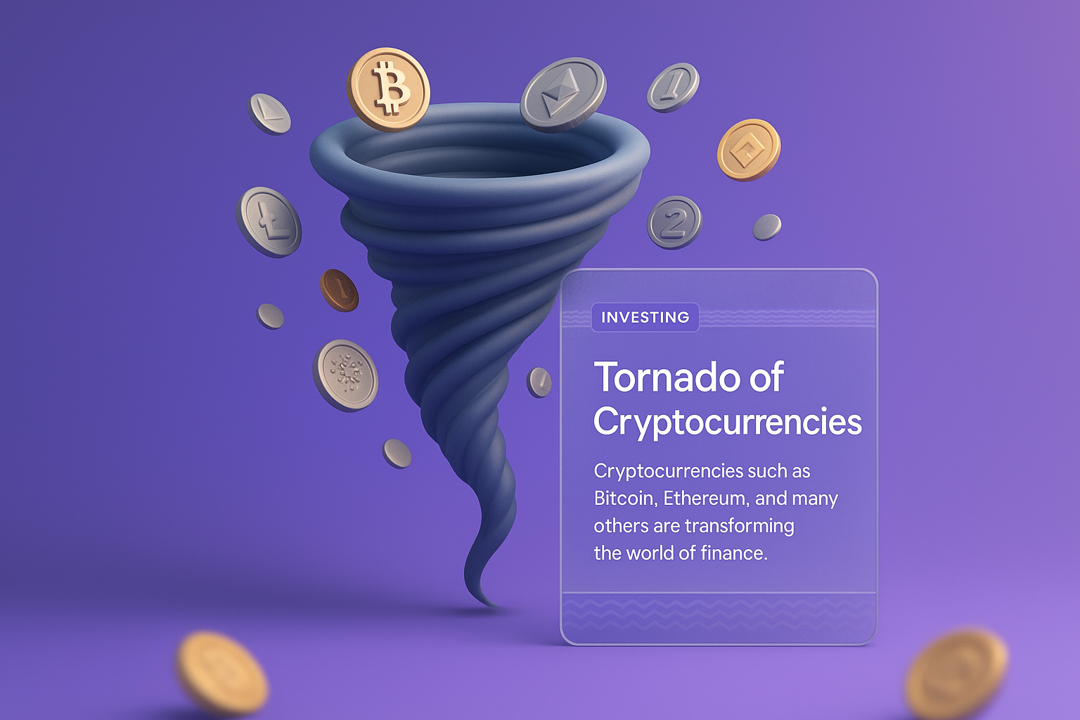 /Collection: /by davooda/Type: PNG/A dynamic 3D illustration of a tornado made from cryptocurrency symbols, including Bitcoin and Ethereum, set against a smooth gradient background. The design integrates a text block with a label, enhancing the theme of financial transformation.