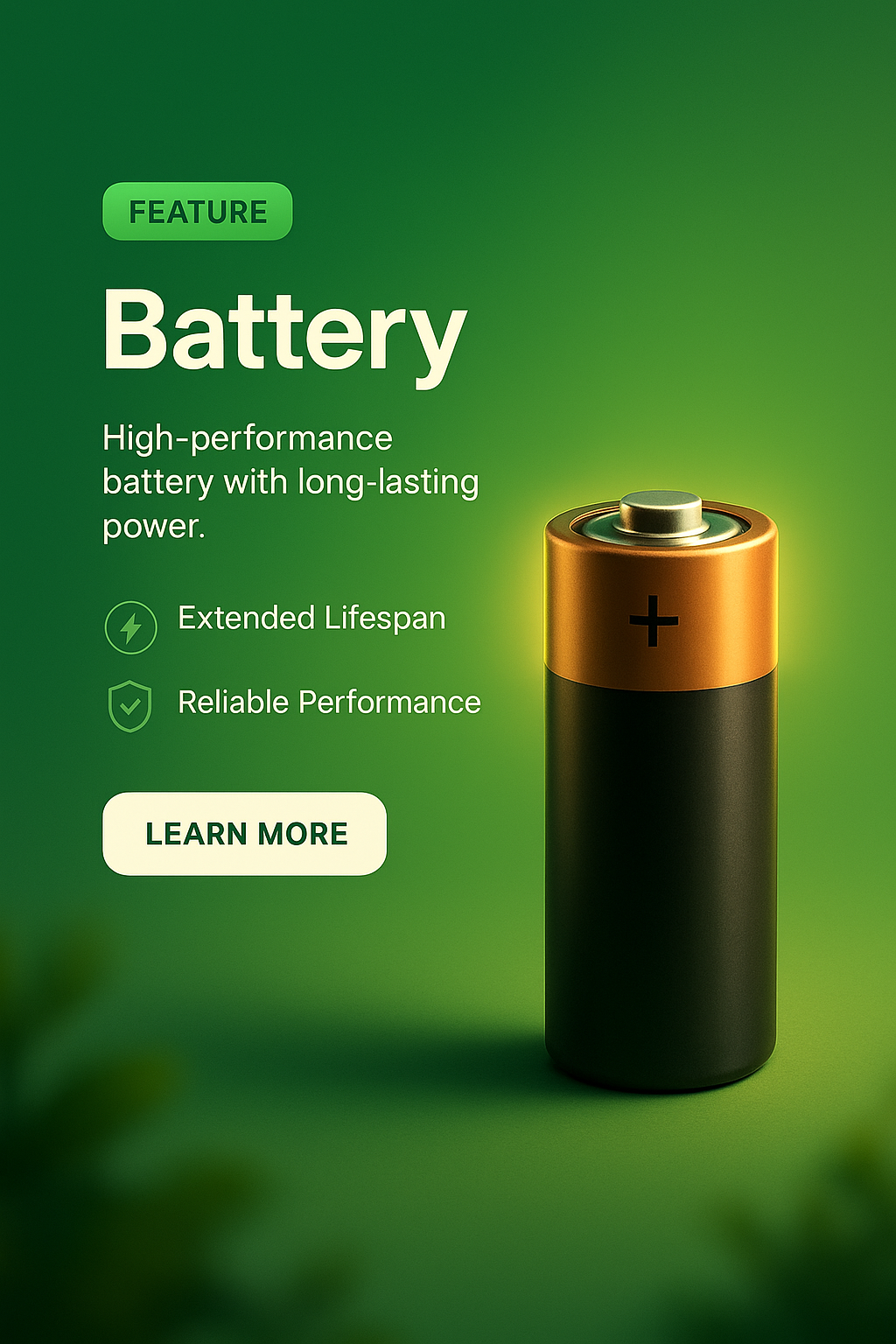 This promotional graphic showcases a high-performance battery. It features a modern design with a gradient background, highlighting the product's reliability and longevity. Ideal for product marketing.