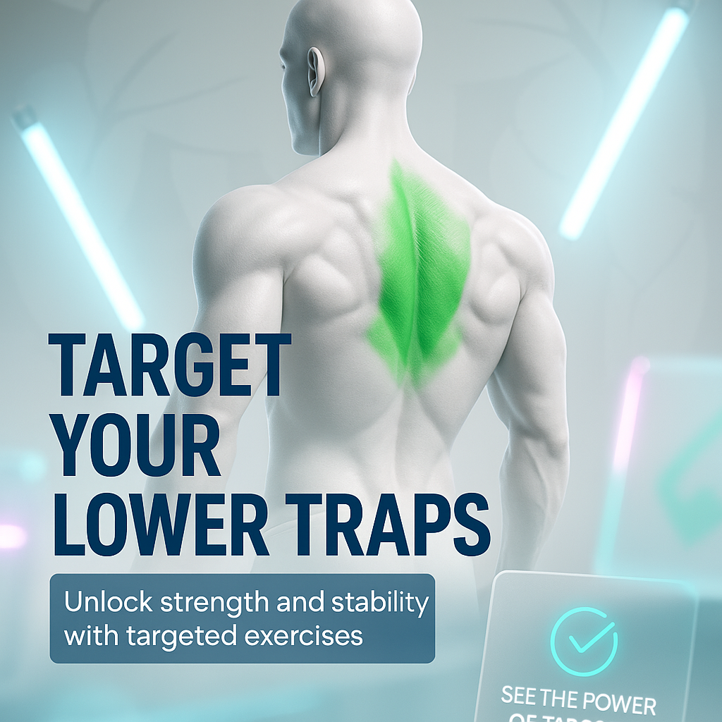 An informative fitness graphic showcasing a muscular back with emphasis on lower traps. Ideal for workout guides or fitness coaching, featuring modern design elements.