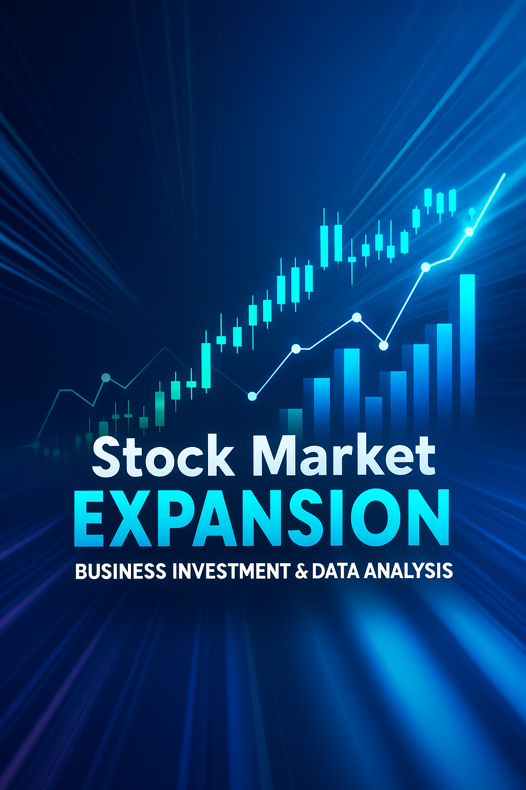 /Collection: /by davooda/Type: PNG/An engaging visualization of stock market expansion featuring vibrant financial charts and indicators. The composition uses a dynamic perspective against a dark blue gradient background, enhancing the theme of business investment and data analysis.