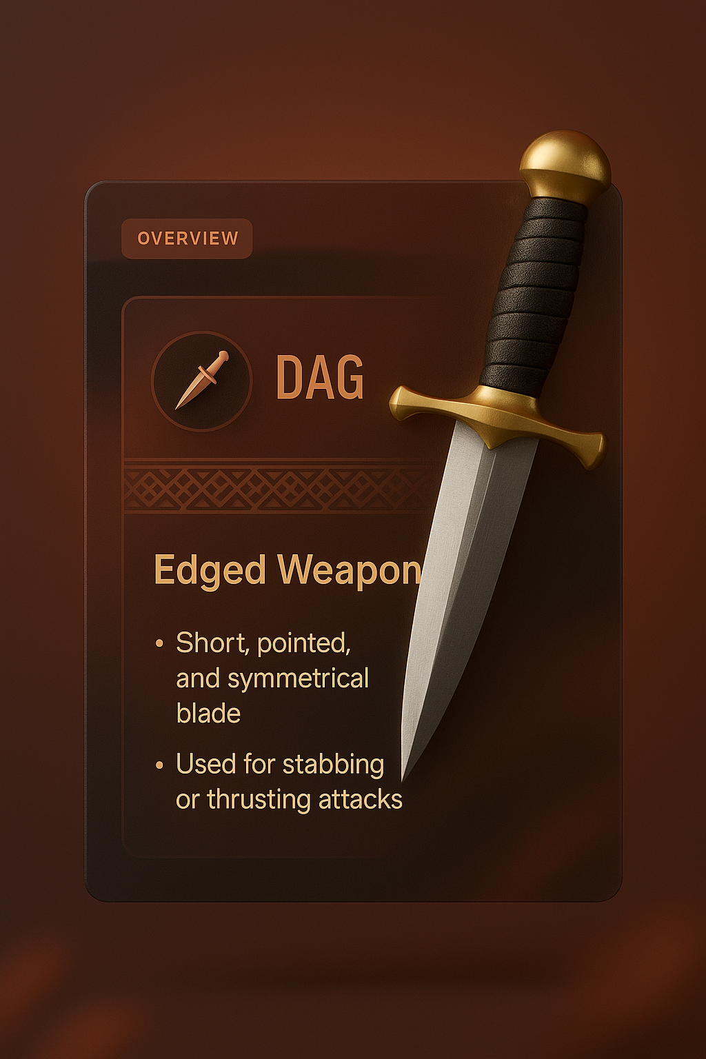 /Collection: /by davooda/Type: PNG/A 3D illustration of a dagger set against a smooth gradient background, featuring a transparent glass overlay. The design includes an overview block with a title, icon, and descriptive text.