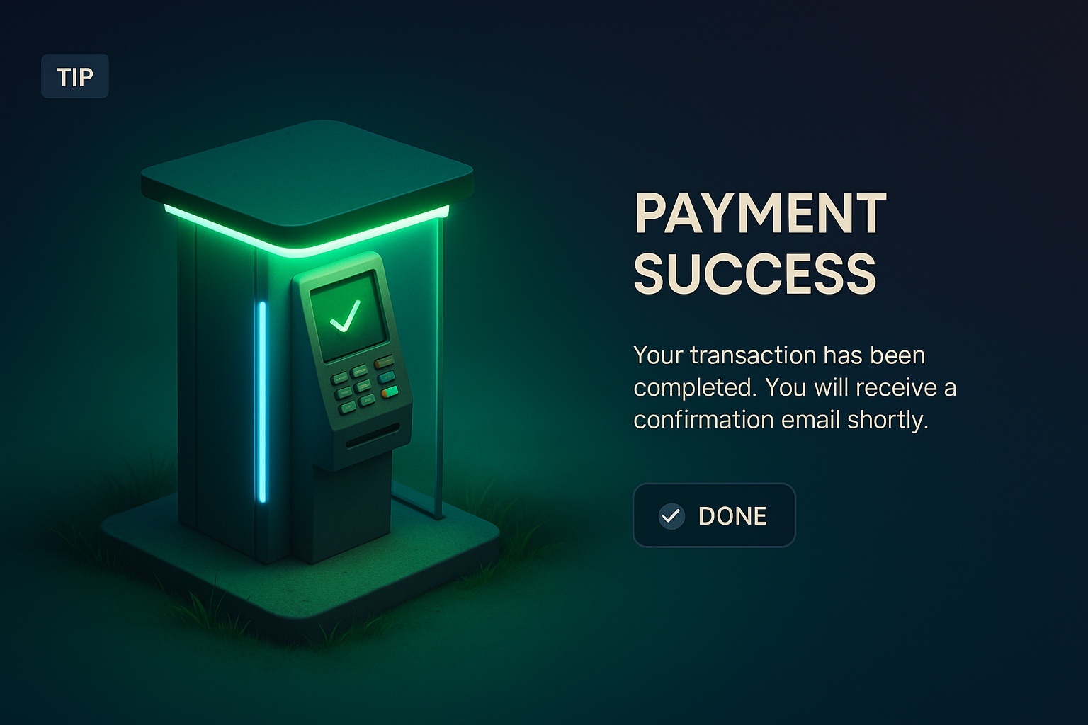 A zoomed-out 3D scene showcasing a neon-lit payment terminal with a success message. The dark background contrasts with vibrant neon accents, creating an atmospheric effect.