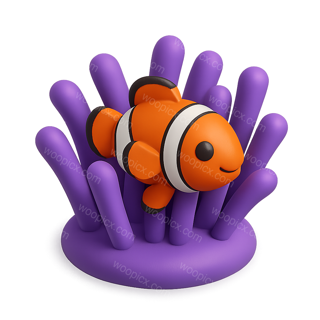 /Premium/Collection: /by davooda/Type: PNG/A charming 3D illustration of a clownfish swimming within a vibrant purple anemone. The image features a friendly clownfish with orange and white stripes, set against a soft gradient background that enhances its 3D effect.