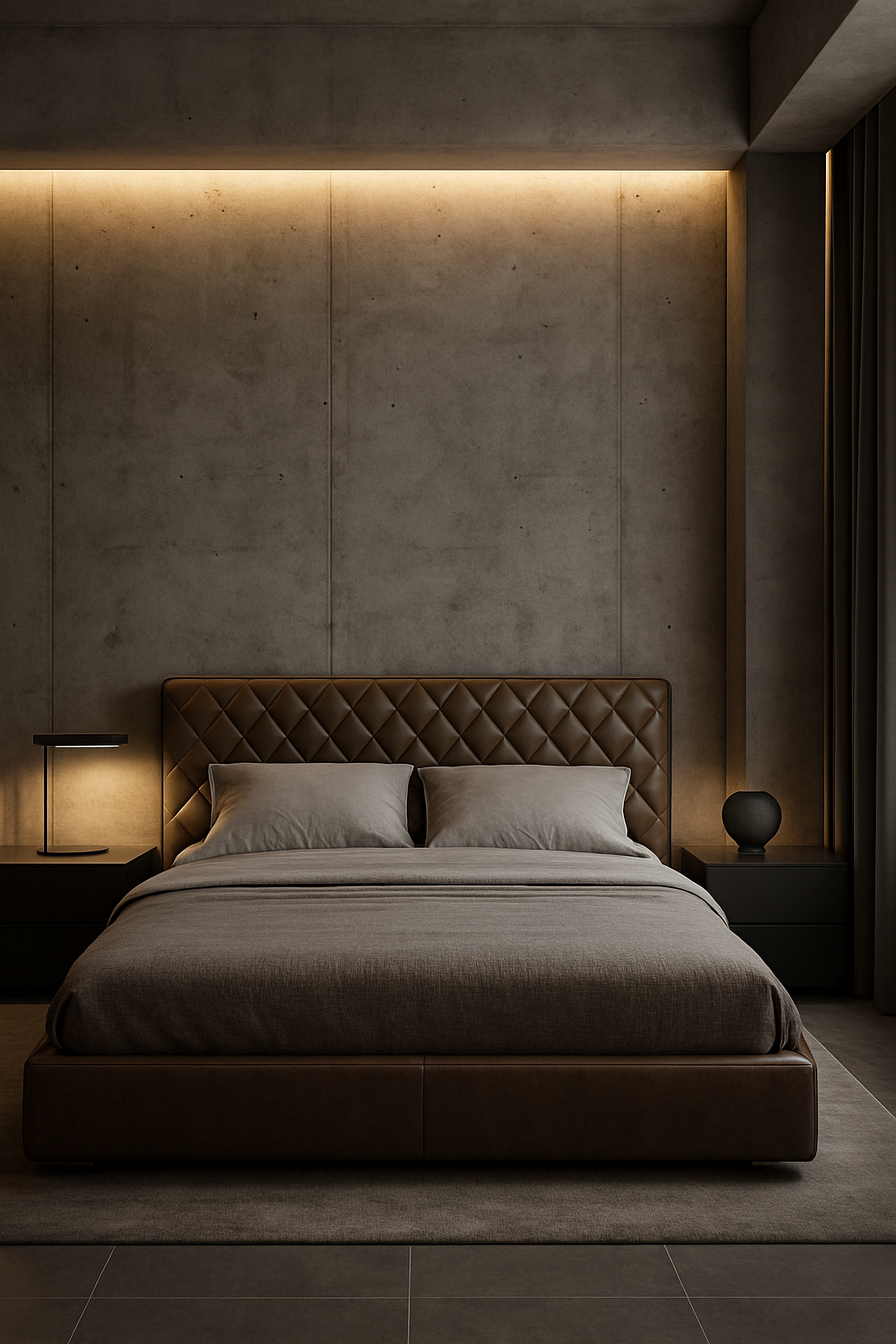 /Collection: /by davooda/Type: PNG/This image showcases a contemporary minimalist bedroom featuring a stylish leather bed, soft ambient lighting, and sleek concrete walls, creating an elegant atmosphere.