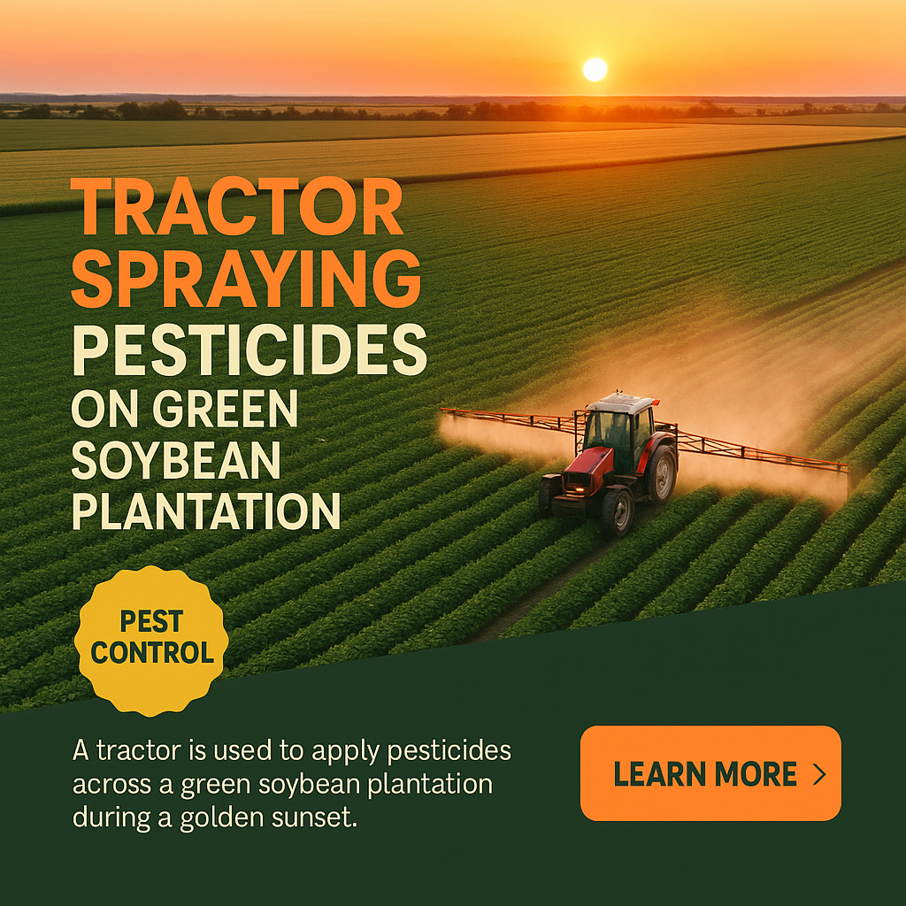/Collection: /by davooda/Type: PNG/An aerial view of a tractor applying pesticides on a vibrant green soybean plantation during sunset. The scene showcases layered composition and balanced colors.