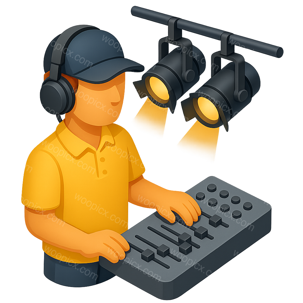 /Premium/Collection: /by davooda/Type: PNG/A 3D icon depicting a theater technician in a yellow shirt using a sound mixing console, with spotlight lights above. The design features a transparent background and an isometric view.