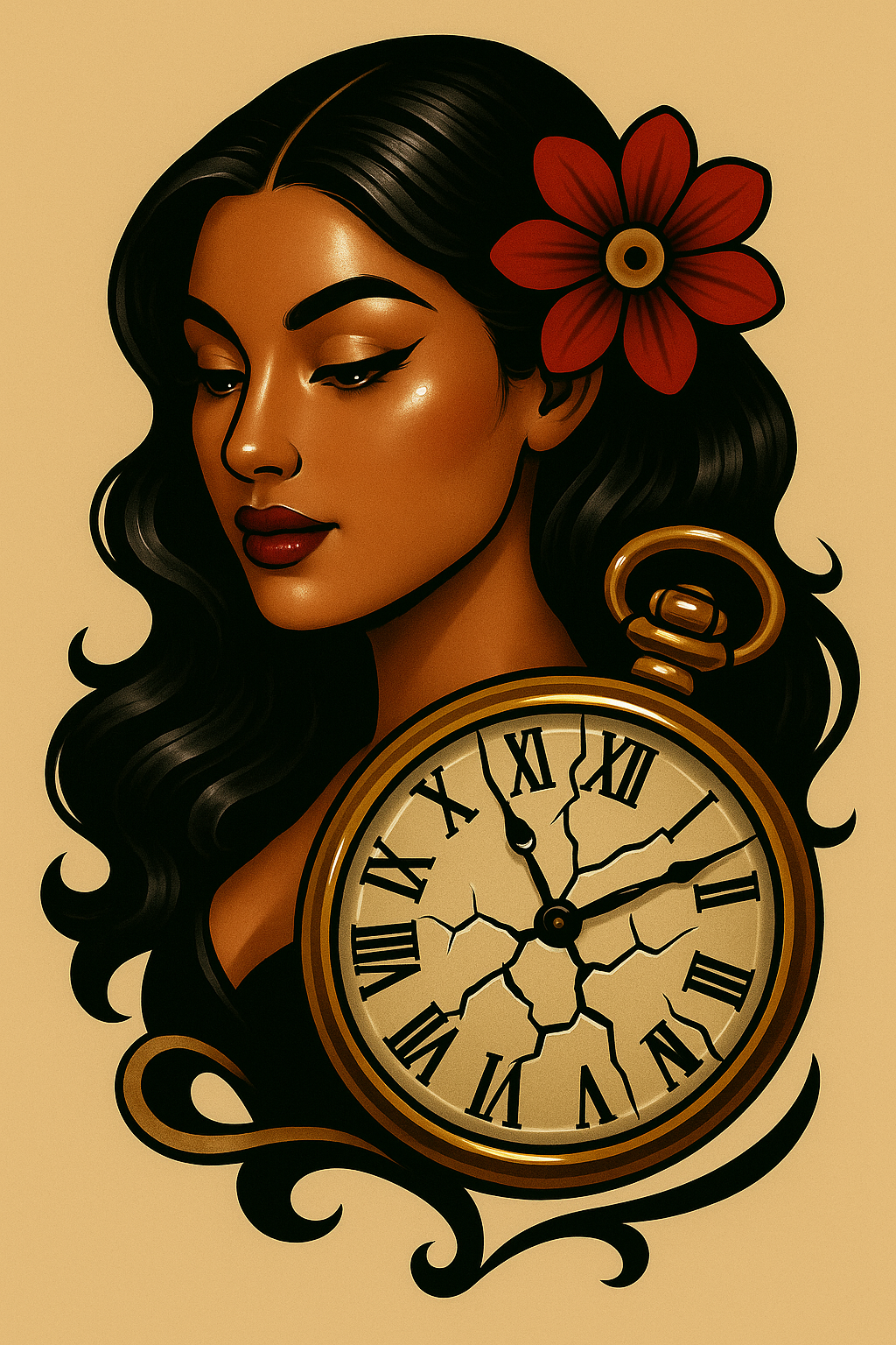 /Collection: /by davooda/Type: PNG/A striking illustration of a woman with long, flowing hair adorned with a red flower, next to a cracked clock. The artwork features glossy anime-like highlights and a beige background, reminiscent of classic tattoo art.