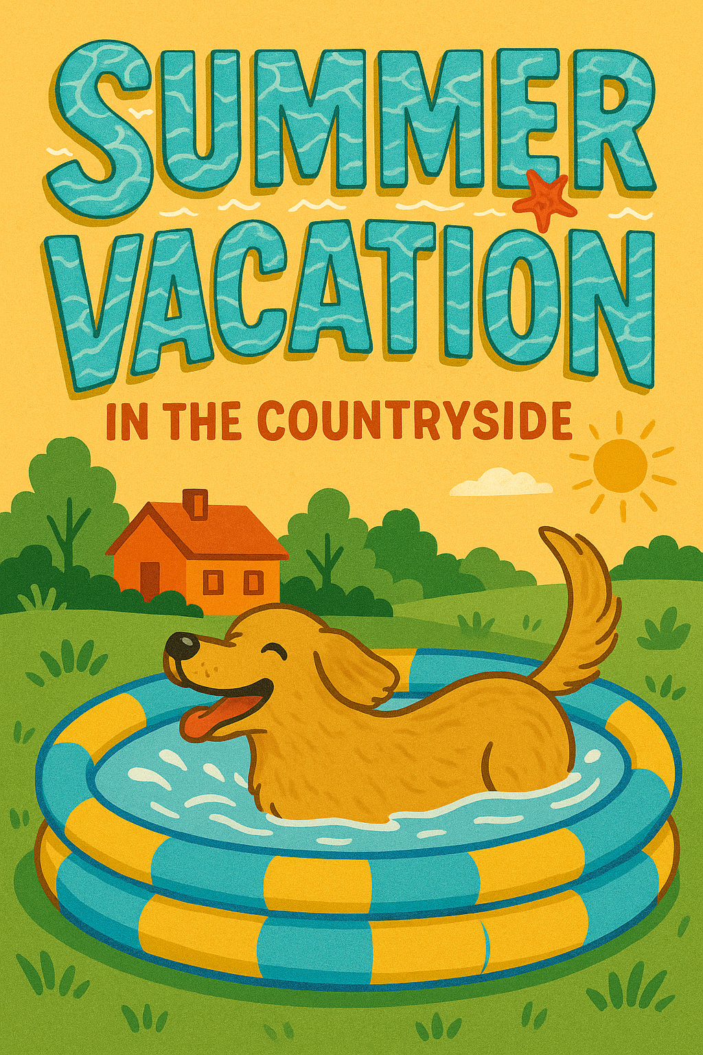 /Collection: /by davooda/Type: PNG/Vibrant and playful illustration depicting a joyful dog in a kiddie pool, set against a countryside backdrop. Ideal for summer-themed content or children's materials.
