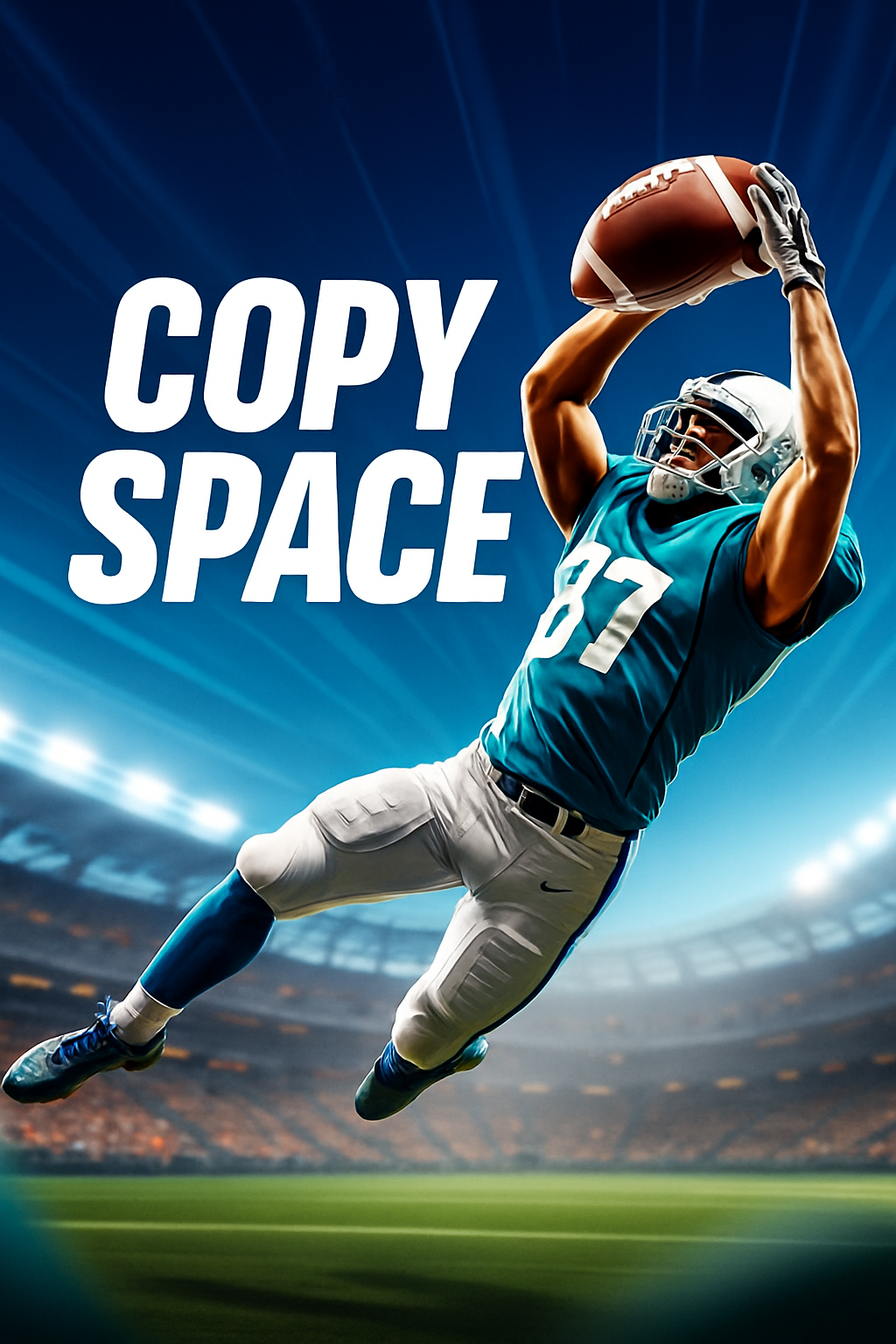 An American football player leaps to catch a ball mid-air against a vibrant football arena background, emphasizing dynamic movement and energy. The scene features ample copy space for text.