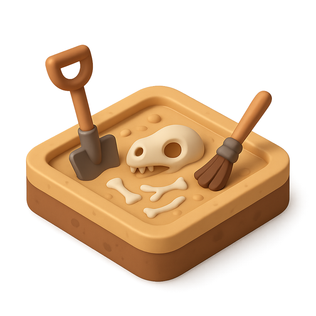 This 3D icon showcases an archaeological dig scene with a sandbox filled with bones and a dinosaur skull. Tools like a shovel and brush are included.