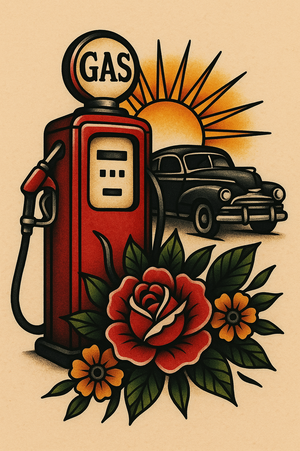 A vibrant illustration featuring a retro gas pump adorned with flowers and a classic car, ideal for automotive enthusiasts and retro design lovers.