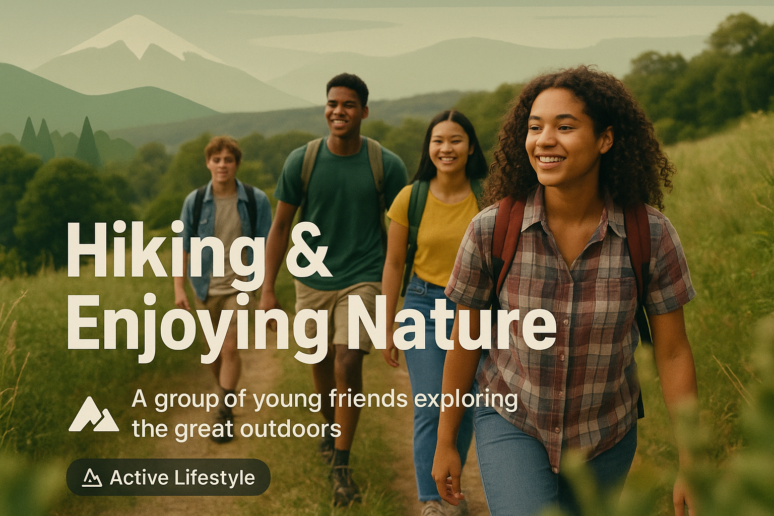Vibrant outdoor scene featuring a group of young friends enjoying a hike through nature, perfect for promoting active lifestyles and outdoor activities.