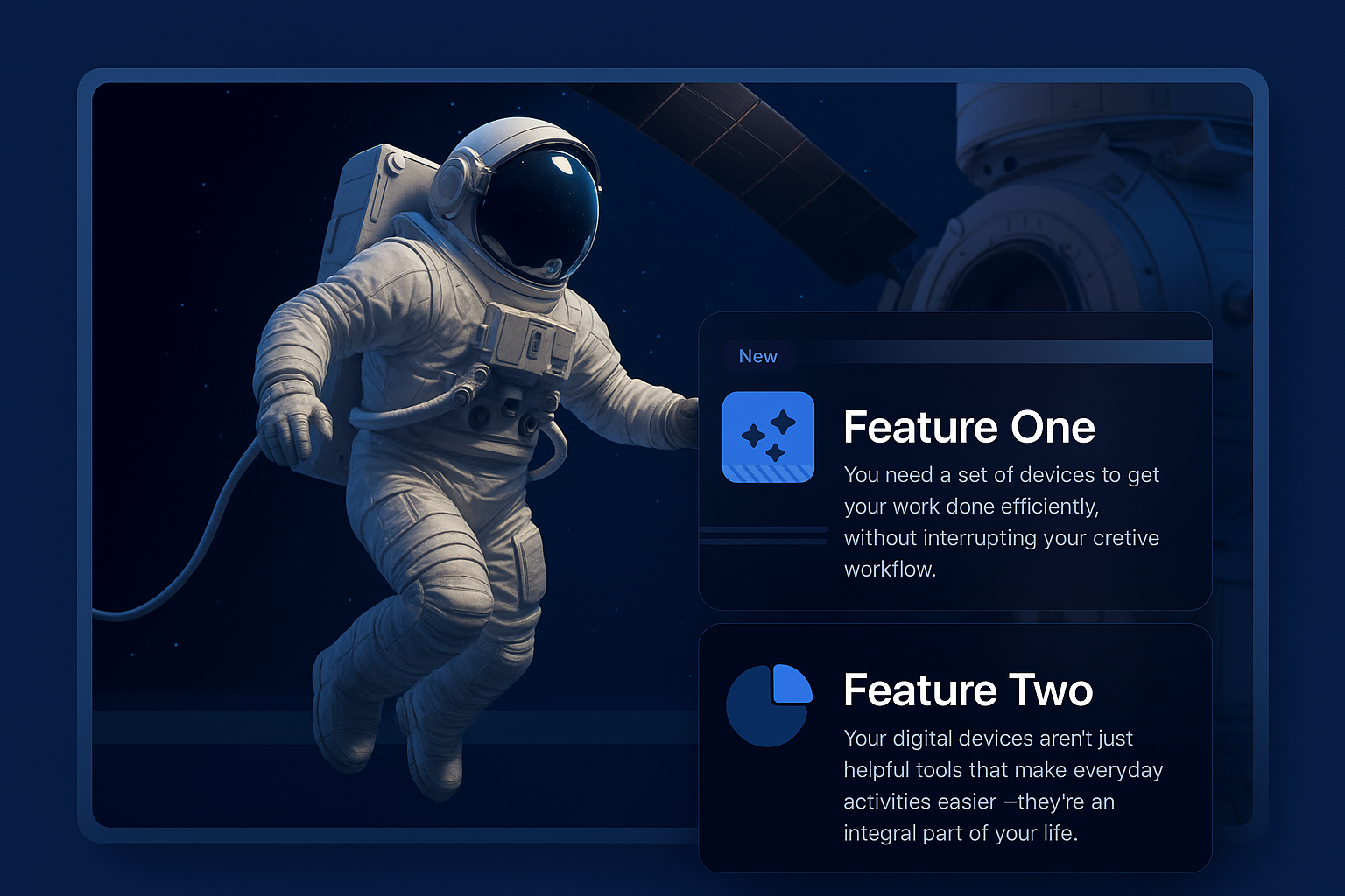 A realistic 3D illustration of an astronaut in a space environment, featuring two blocks of text highlighting key features. The background is a smooth gradient, enhancing the overall depth.