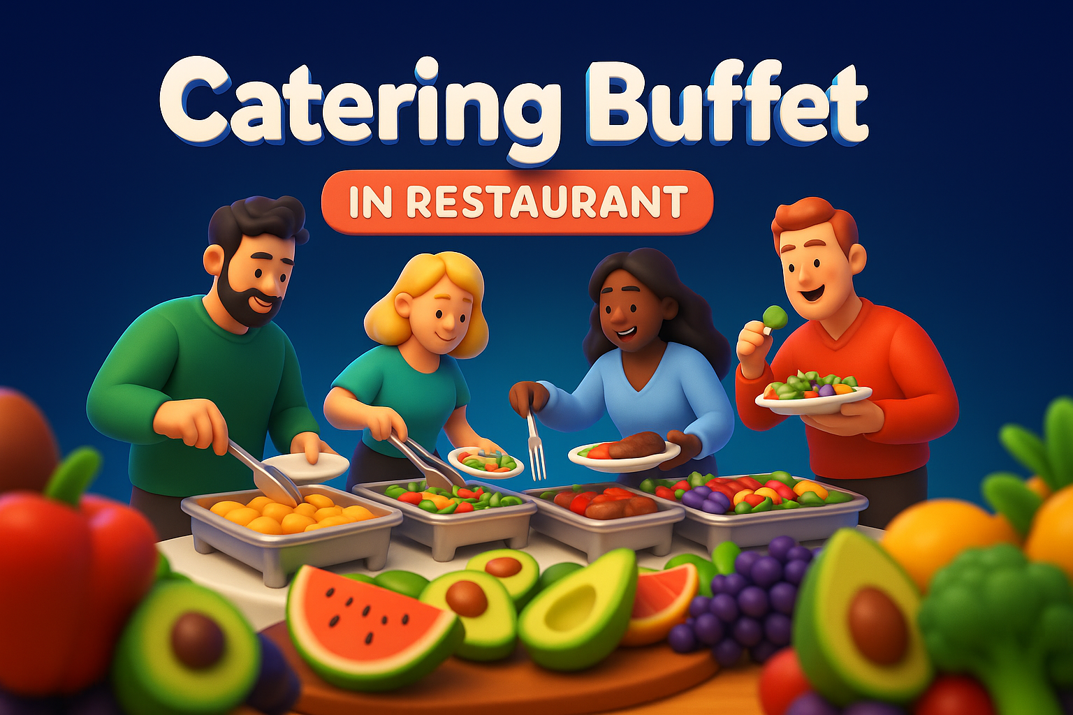 A vibrant 3D illustration showcasing a lively catering buffet in a restaurant. Diverse people serve colorful food including meat, fruits, and vegetables.