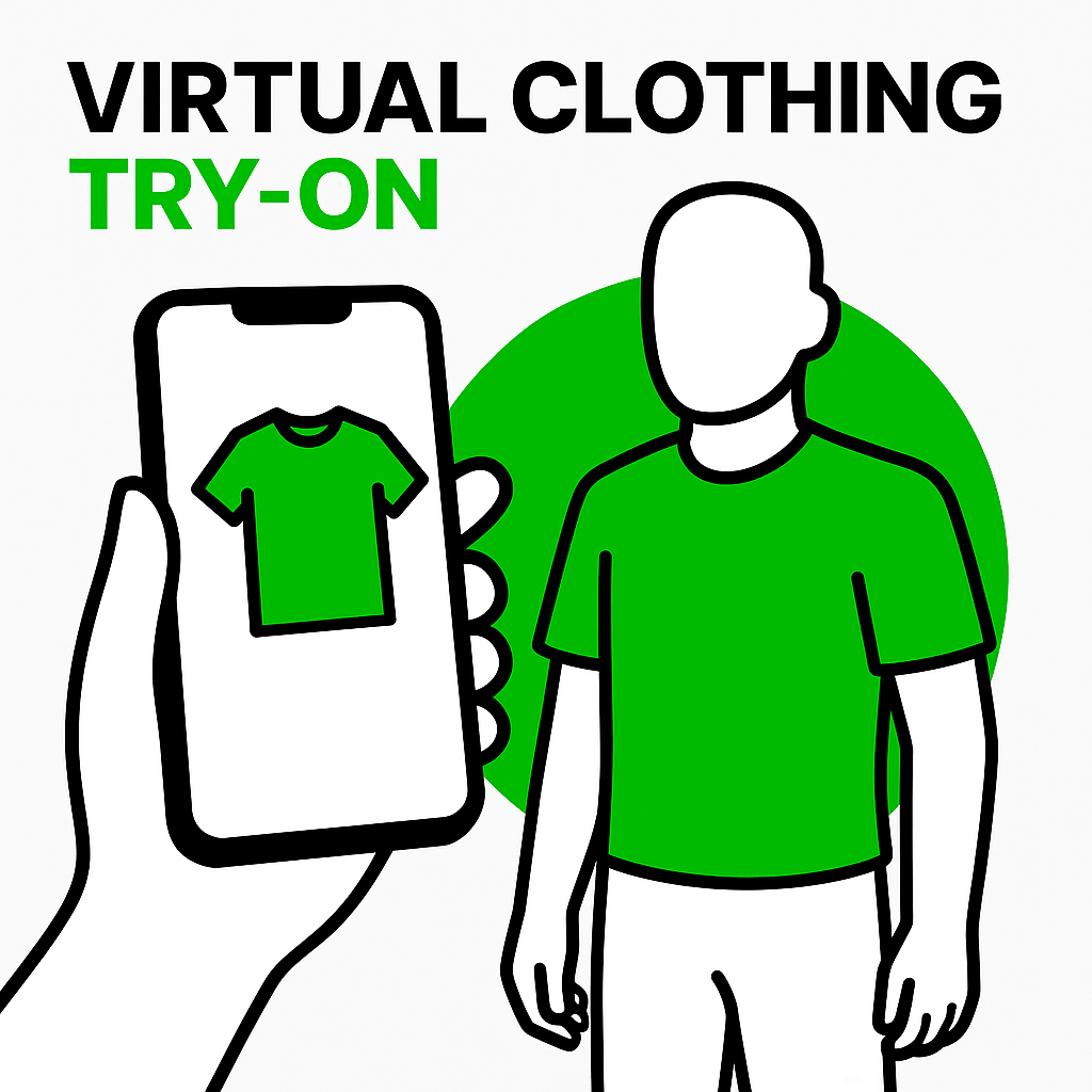 /Collection: /by davooda/Type: PNG/A modern and minimalistic graphic illustrating the concept of virtual clothing try-on, featuring a smartphone displaying a shirt and a figure wearing the clothing. Suitable for e-commerce and fashion technology marketing.