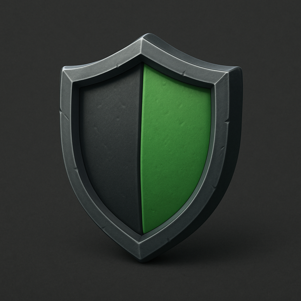 A three-dimensional shield icon featuring a split design in black and green, set against a dark gray background. The shield has a textured surface and a stylized appearance.