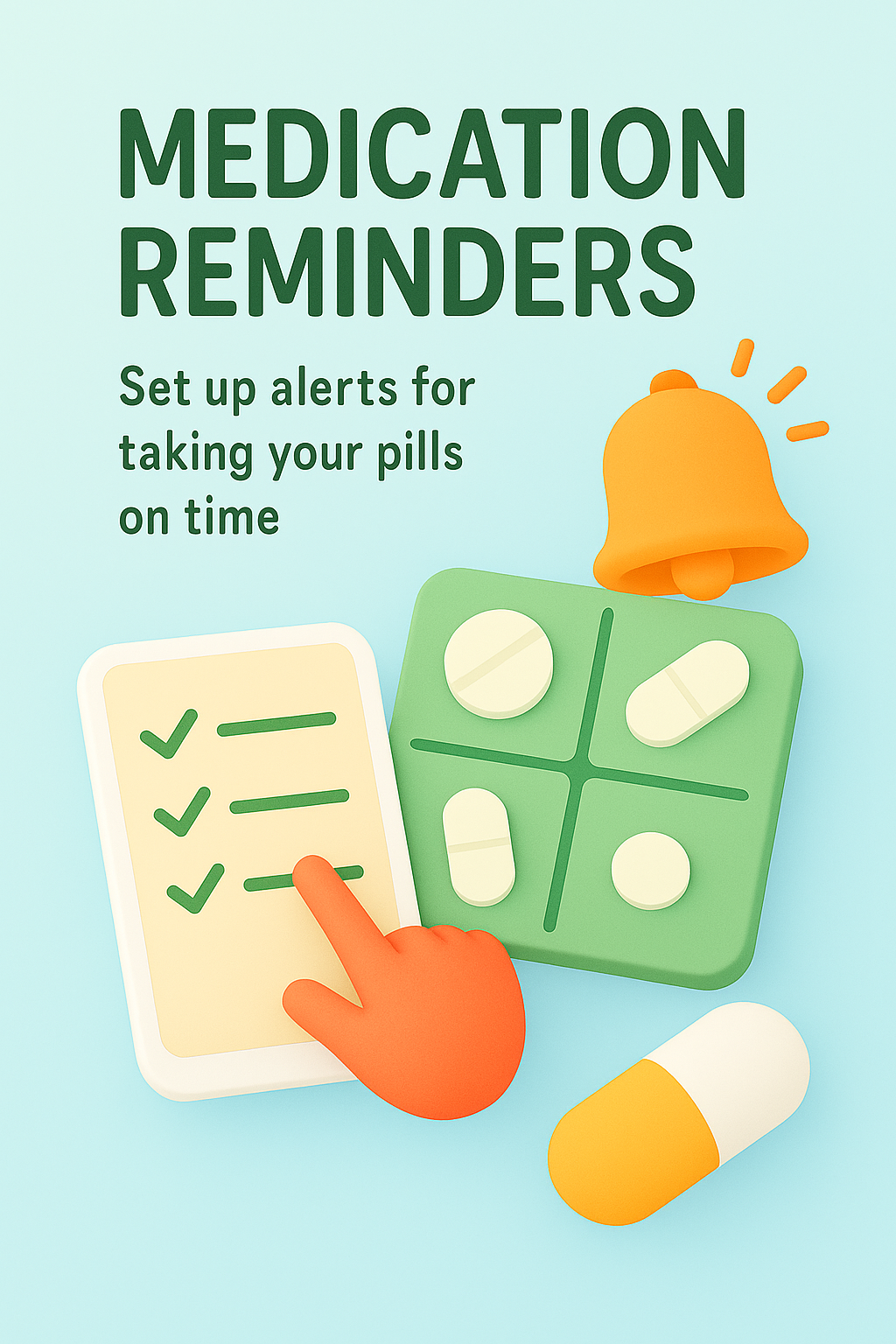 Illustrative graphic promoting a medication reminder app, featuring playful design elements like pills, checklists, and alert icons, ideal for healthcare marketing.