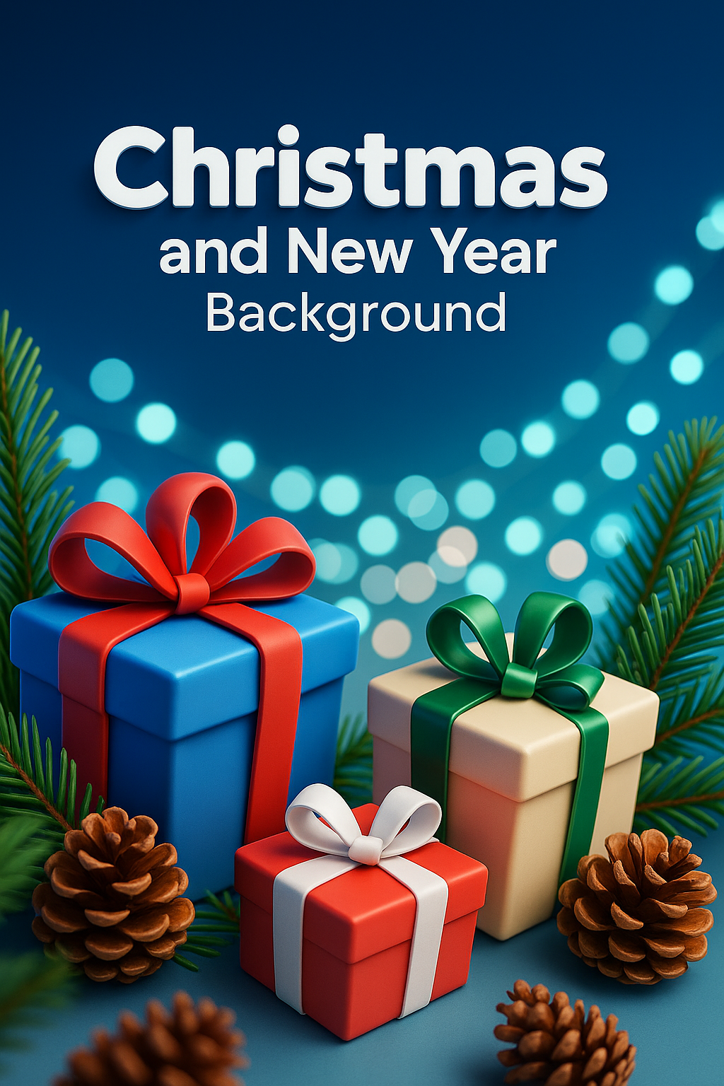 /Collection: /by davooda/Type: PNG/A vibrant 3D illustration featuring colorful gift boxes with bows, surrounded by pine cones and branches. The backdrop includes soft bokeh garlands, creating a festive atmosphere.