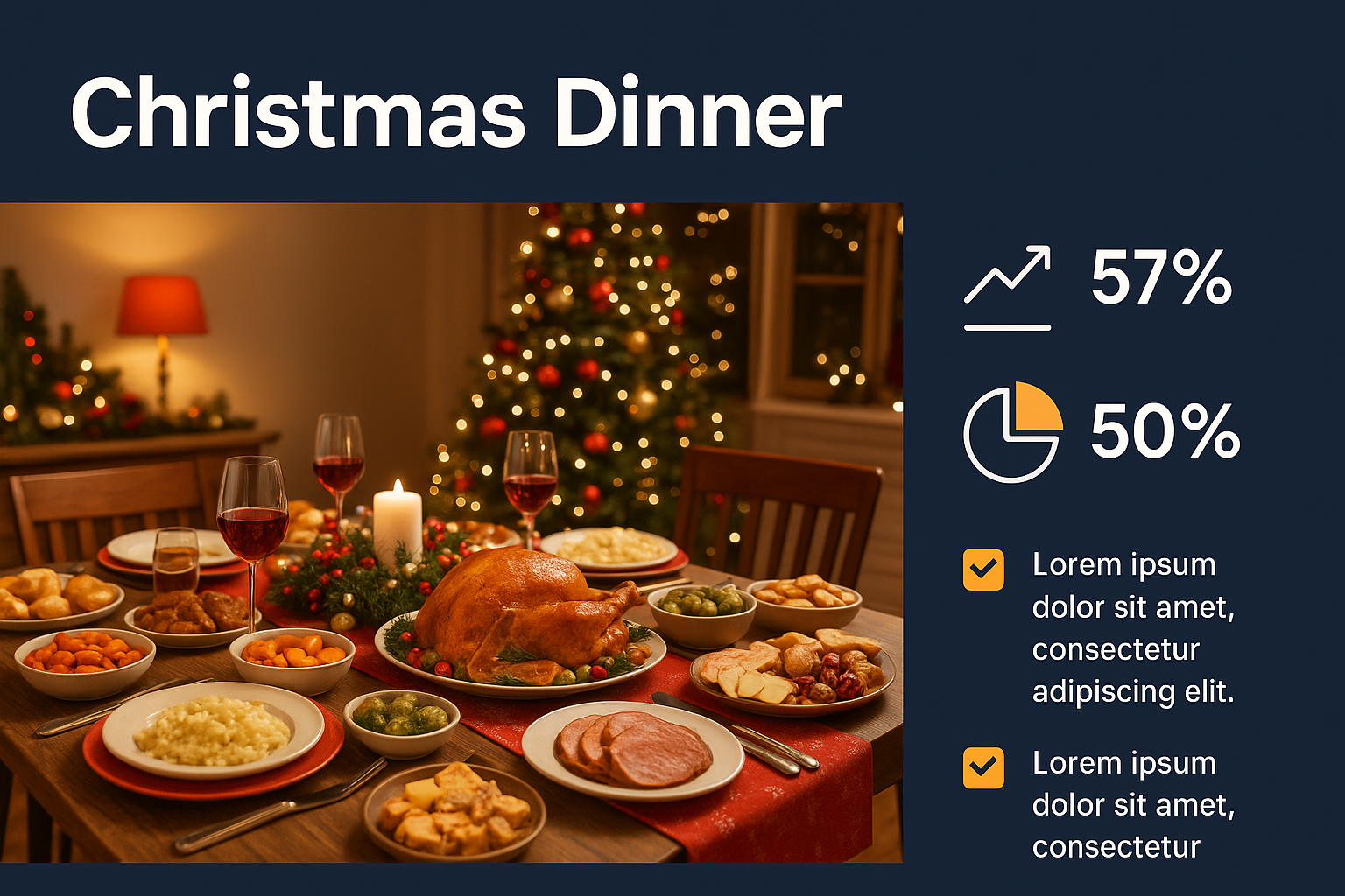 A beautifully arranged Christmas dinner table showcasing a variety of festive dishes, perfect for holiday-themed presentations or marketing materials.