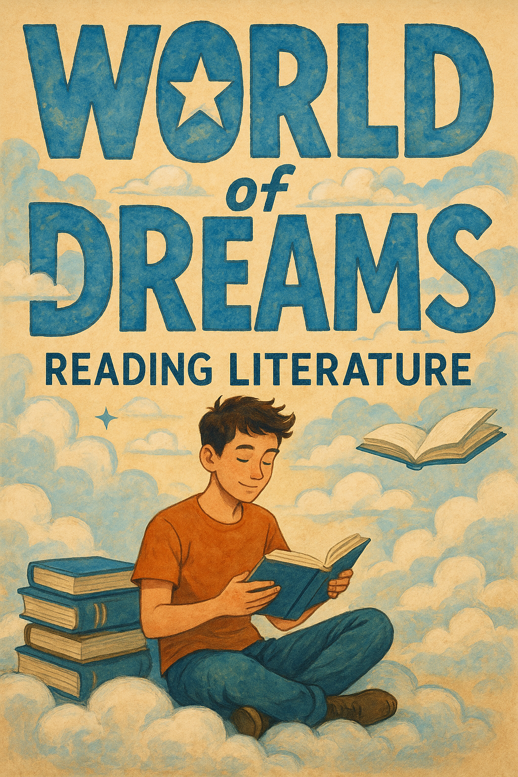 /Collection: /by davooda/Type: PNG/Charming illustration depicting a young boy reading a book among clouds, symbolizing the joy of literature. Ideal for educational content or children's book covers.