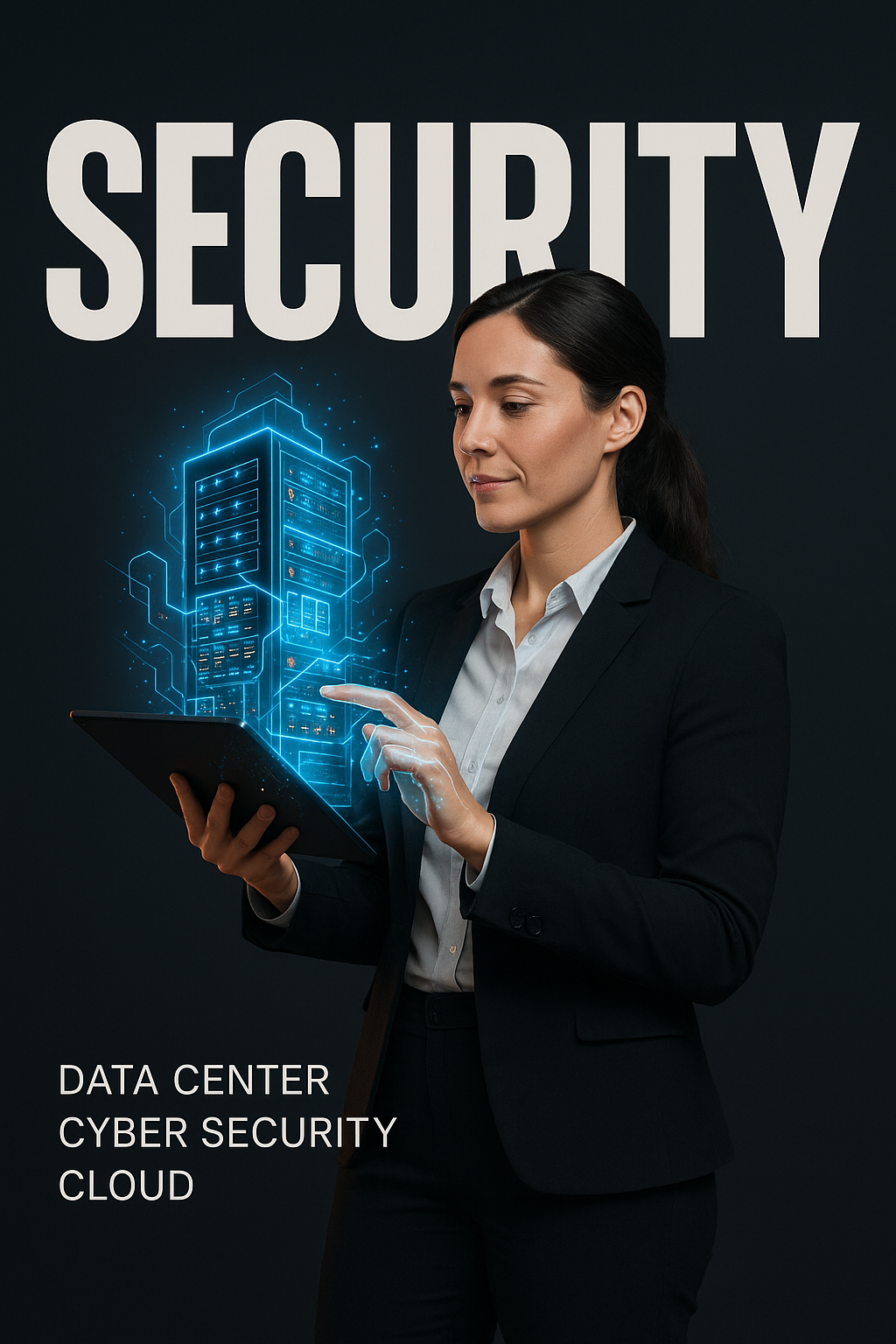 /Collection: /by davooda/Type: PNG/A confident female IT specialist operates a tablet, engaging with augmented VFX in a data center setting. The backdrop features a dark gradient, emphasizing the theme of cyber security and cloud computing.