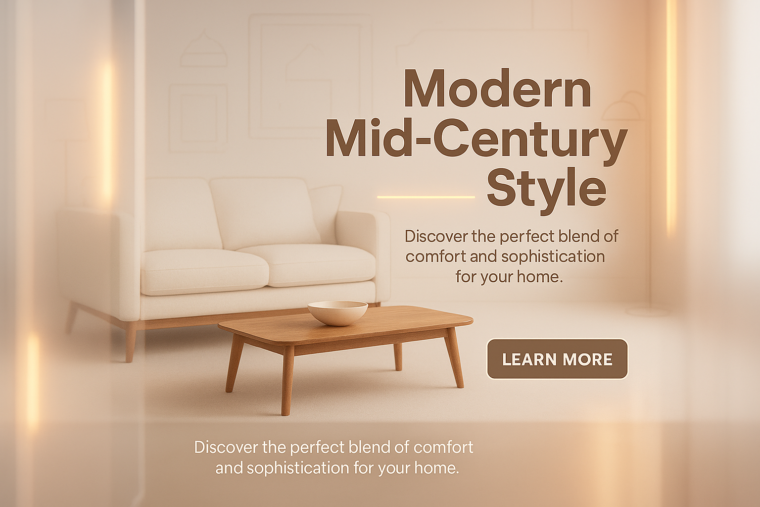 Stylish promotional graphic showcasing a modern mid-century living room setting, perfect for interior design marketing aimed at home decor enthusiasts.