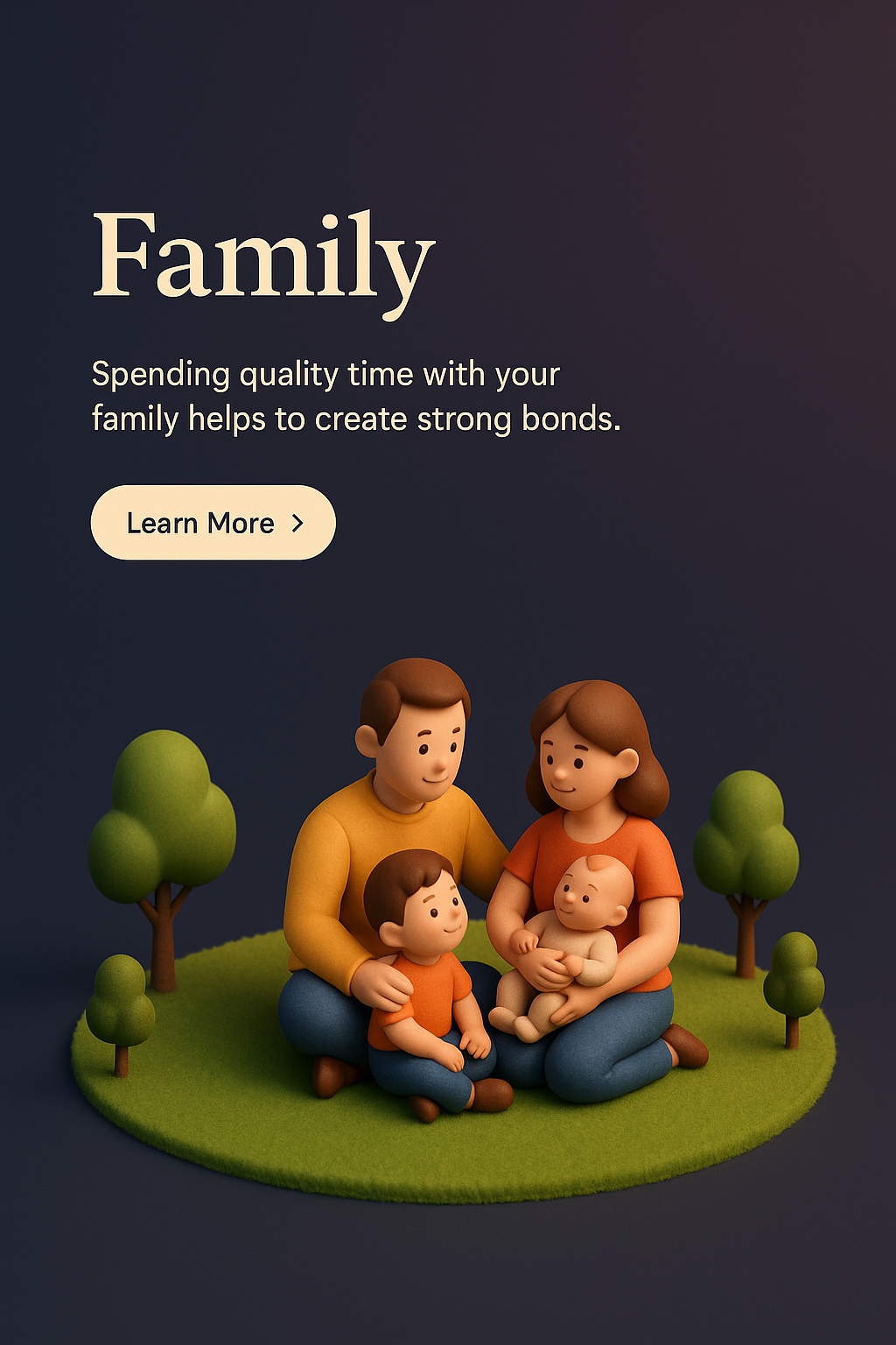 /Collection: /by davooda/Type: PNG/A beautifully crafted 3D scene depicting a family spending quality time together. The characters are stylized and small, surrounded by simple greenery on a dark gradient background.
