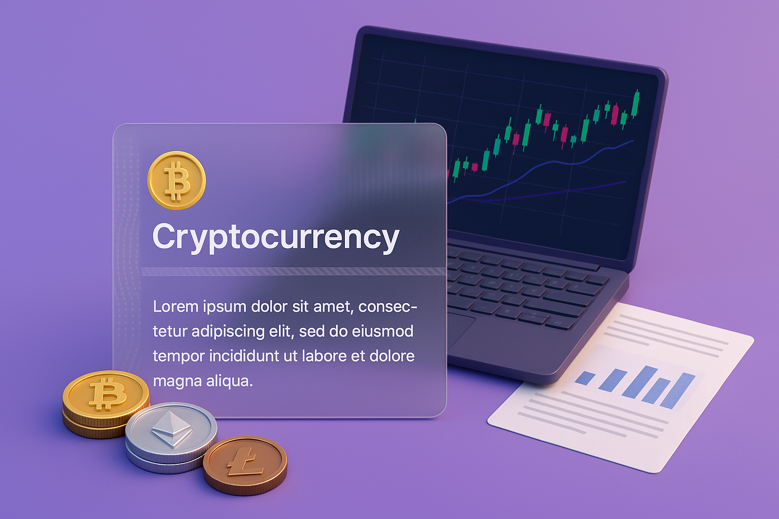 A modern desk scene featuring crypto coins, a laptop displaying price graphs, and a printed report. The design incorporates a translucent panel with text, creating a sleek, professional look.